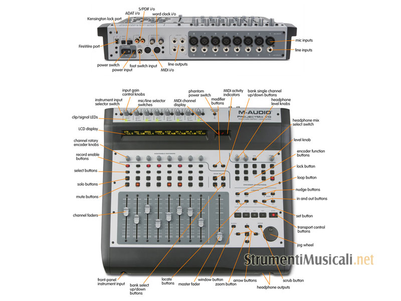 • pulsanti mic/line, rec, select, solo e mute su ciascun canale