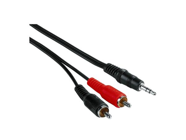 Cavo audio stereo con due connettori RCA maschio ed un mini jack stereo.