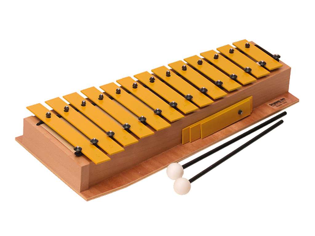Glockenspiel Alto Diatonico DO2 - LA3. Barre in lega di acciaio e box in legno massello. Dotato di barre Fa# e Sib intercambiabili.