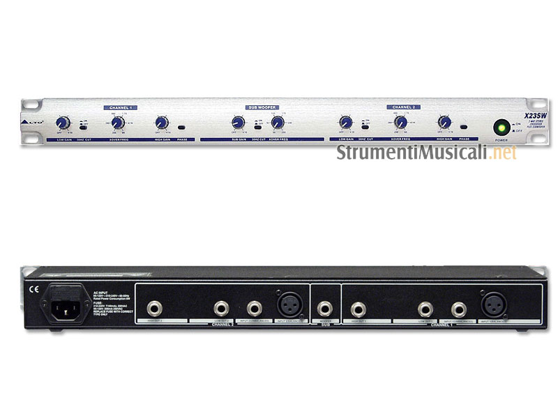 Il crossover ALTO X23SW è un apparecchio alto una singola unità rack, un crossover elettronico attivo in grado di gestire il controllo delle frequenze per sistemi di casse acustiche nel modo stereo a 2 vie. Il crossover elettronico X23SW è una soluzione ideale di crossover per la maggior parte di impianti di diffusione pubblica piccoli e grandi, im-pianti di amplificazione dal vivo, installazioni commerciali, monitor per studi di registrazione e sistemi di amplifi-cazione per DJ. Oltre alla sua versatilità per adeguarsi a differenti sistemi di amplificazione, il crossover X23SW ha funzioni avanzate come i led indicatori di clip ed interruttori individuali di fase e per ogni banda di frequenza. Il crossover attivo X23SW è un crossover attivo efficiente ed affidabile e vi darà un controllo preciso contribuendo al suono eccellente del vostro impianto di amplificazione.