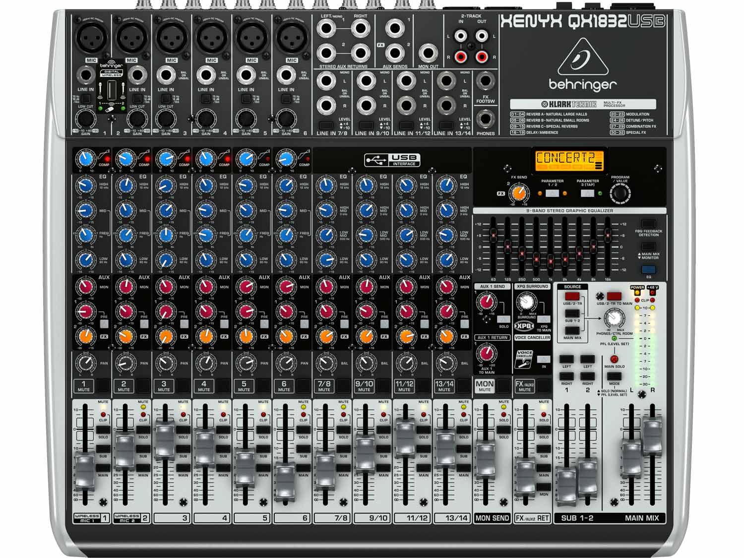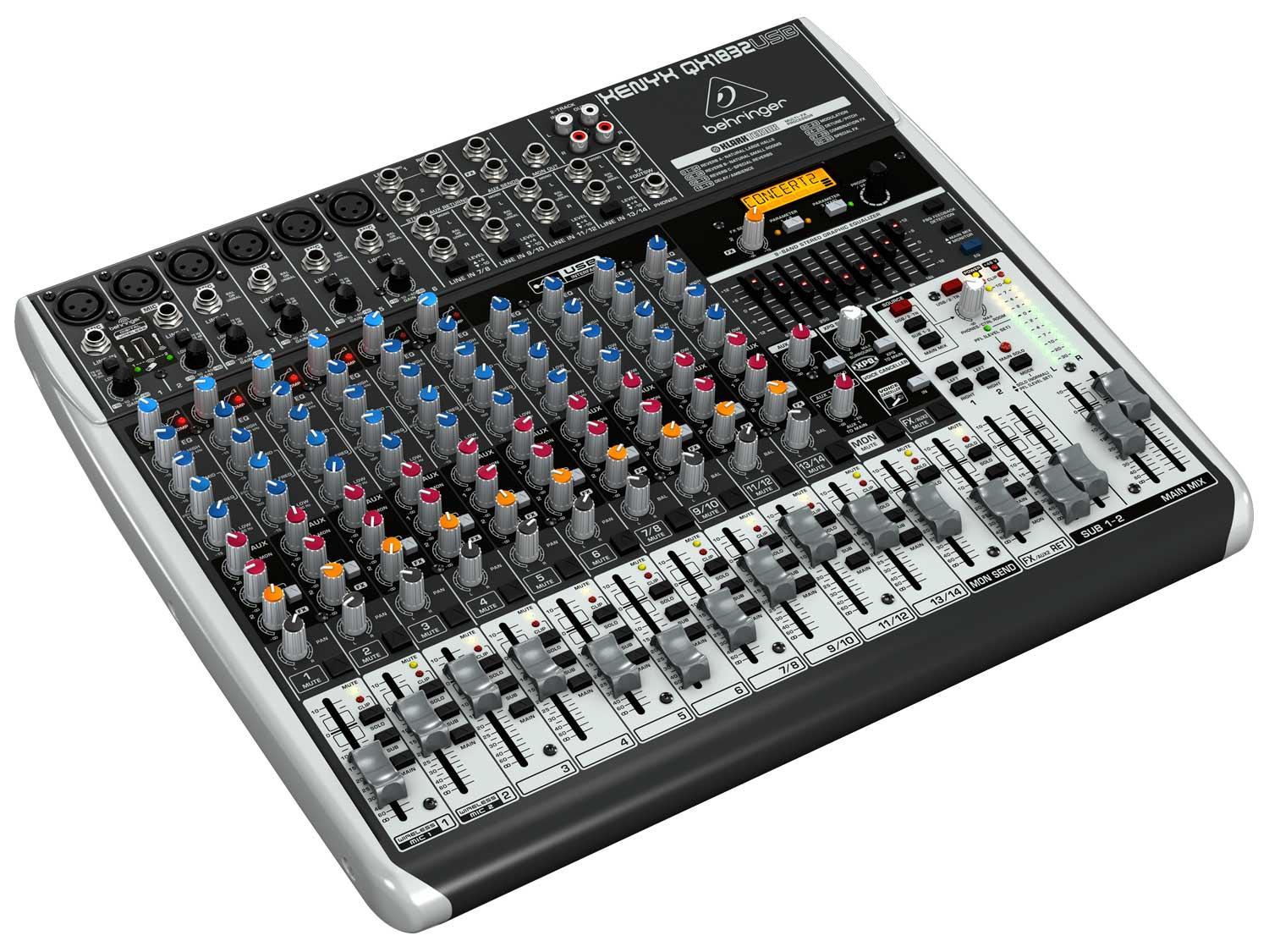 Equipaggiati con preamplificatori microfonici premium e di un robusto set di funzionalità tipicamente riservati alle console più costose, i mixer di nuova generazione della serie XENYX Q USB sono in grado di gestire concerti dal vivo e di fornire strumenti per registrazioni di qualità professionale. Il Behringer QX1832USB dispone dell'integrazione "wireless-ready" per i microfoni USB della Serie ULM, di un interfacce USB / Audio, compressori "one-knob" e motore effetti Klark Teknik.
