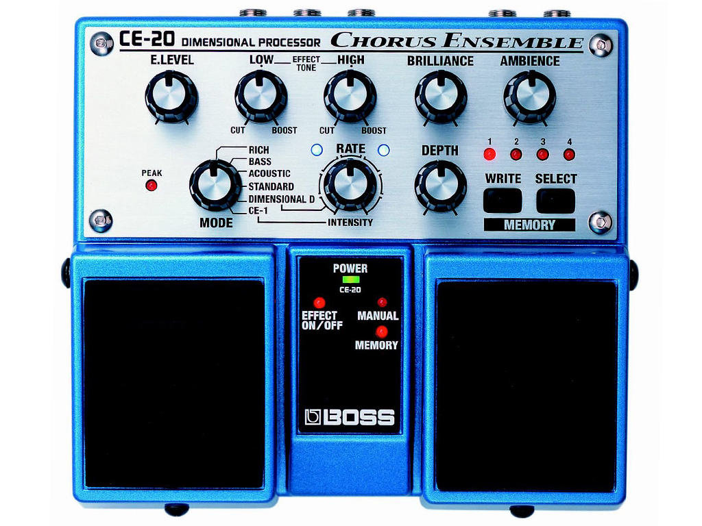 CE20 Chorus Ensemble è la sintesi di 25 anni d'esperienza Boss. Questo twin pedal non include solamente i classici modelli di chorus come il CE-1 e l'SDD-320, ma anche nuovi effetti inclusi chorus per basso e per chitarra acustica. Le nuove regolazioni "Brilliance" e "Ambience" offrono un controllo sui parametri di chorus mai utilizzati in precedenza. Grazie alle quattro memorie a disposizione è possibile creare le proprie configurazioni.