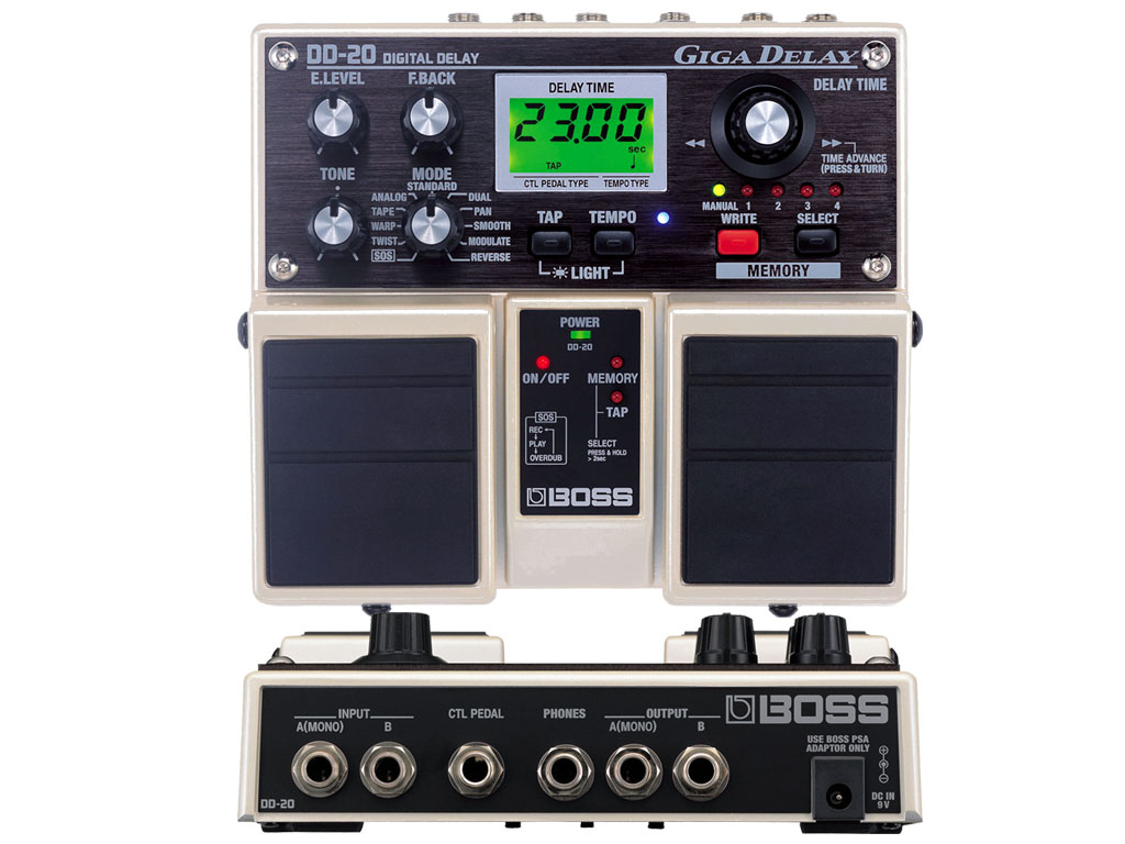 Il BOSS DD-20 Giga Delay offre la più ampia user memory e il più lungo tempo di delay rispetto ad ogni altro pedale. Fino a 23 secondi di delay time possono essere settati utilizzando un pulsante/manopola dedicato o via tap tempo. Con una scelta di 11 modalità che includono i delay di tipo "Smooth" e "Twist" e la registrazione sound on sound questo Twin Pedal si pone al top della categoria.