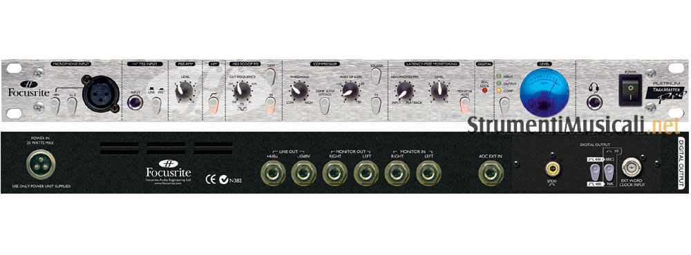Pre Mic. in classe A con Line e Instrument input, High Pass filter, Compressore ottico, Latency Free Monitoring; Mid Scoop EQ.