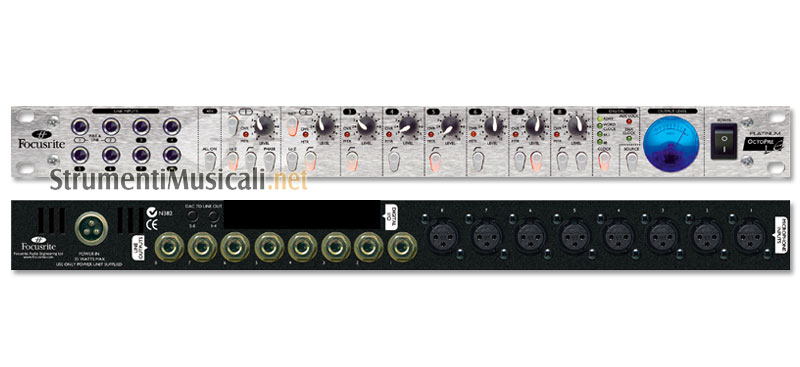 Modulo da 8 Pre- Mic Focusrite ( modulo espansione opzionale: AD/DA a 24 bit); 2 Ch con DI ad impedenza variabile; Phantom Power; VU Meter assegnabile ad ogni canale.