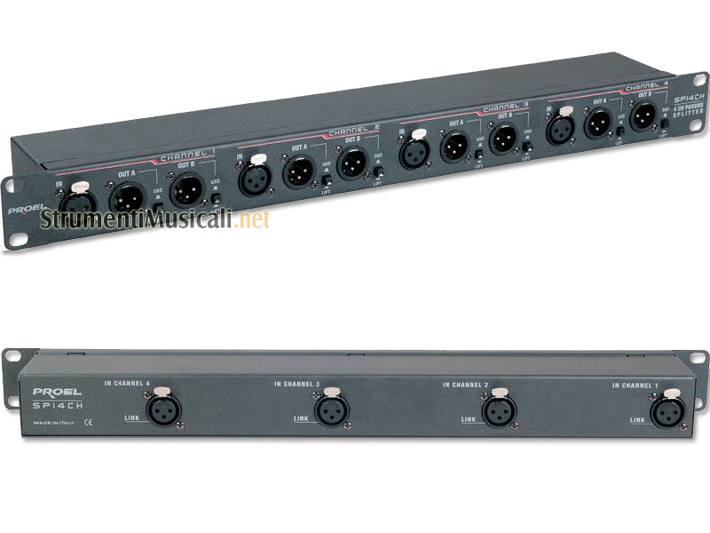 Splitter passivo a 4 canali indipendenti bilanciato passivo (XLR 3 poli) con trasformatore, rapporto 1:1 ad alta impedenza in ingresso. 1 U rack 19”. Controllo uscite GND/LIFT.