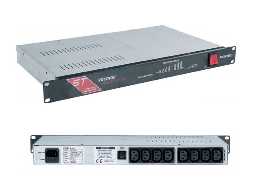Gli stabilizzatori ad alte prestazioni PROEL, disponibile nella versione rack 19" e da pavimento, sono concepiti per proteggere le apparecchiature elettroniche utilizzate nei sistemi musicali da rischi di sbalzi di tensione e disturbi di rete. Lo stabilizzatore è pertanto necessario per la protezione delle apparecchiature digitali, che possono subire instabilità del voltaggio di rete. Il voltaggio principale è adeguatamente filtrato, in modo da alimentare correttamente l'attrezzatura collegata. In particolare, la serie di stabilizzatori a rack "ST" è gestita con sistema digitale (INT-LP) a microprocessore, volto a garantire un esatto monitoraggio digitale e matematico delle uscite. I modelli ST1000 e ST1500 e ST2500 hanno 8 uscite che vi consentono di stabilizzare il voltaggio in uscita a 230V ± 4% e in ingresso da 168V a 271V; è disponibile anche la versione a 115V/60 Hz (versione US).