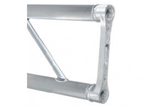 La struttura è in alluminio estruso AlMgSil avente denominazione EN AW 6082 T6 HB 90 (UNI 9006) con tubi correnti da 50mm di diametro e 2mm di spessore. Le diagonali interne sono di alluminio estruso P-Al-Mg-S con denominazione 6060 HB 60 (UNI 9006), con diametro da 20mm e spessore 2mm. I terminali (piastra) sono realizzati con una lega di alluminio GLASI 10 Cul. La soluzione della greca continua rende la struttura gradevole e ne consente l'impiego anche in ambienti di piccole dimensioni. La truss a sezione duo da 29cm presenta due tipi di connessione: una rapida con ogive, spine e molle (PLDSET02PLUS), l'altra con viti e dadi (PLDSET01M10).