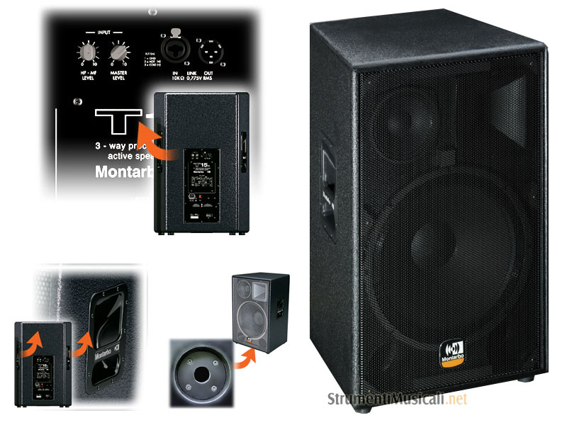 • Componenti (custom): Woofer da 15" con magnete al neodimio (bobina da 3"), Midrange da 6", Driver a compressione da 1" (bobina da 2"), Tromba ruotabile a direttività costante (H 90° x V 70°);