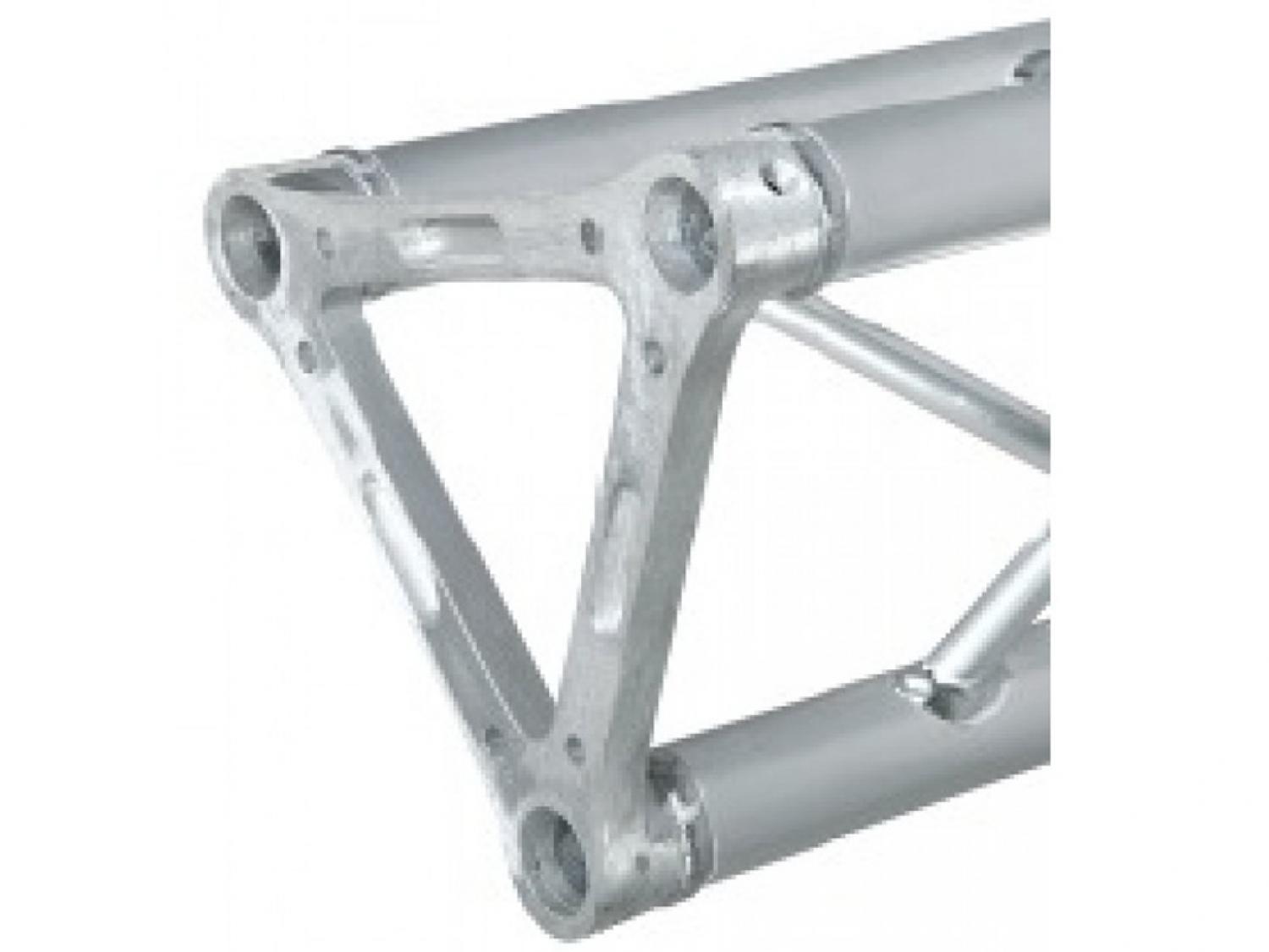 La struttura è in alluminio estruso AlMgSil avente denominazione EN AW 6082 T6 HB 90 (UNI 9006) con tubi correnti da 50mm di diametro e 2mm di spessore. Le diagonali interne sono di alluminio estruso P-Al-Mg-S con denominazione 6060 HB 60 (UNI 9006), con diametro da 20mm e spessore 2mm. I terminali (piastra) sono realizzati con una lega di alluminio GLASI 10 Cul. La soluzione della greca continua rende la struttura gradevole e ne consente l'impiego anche in ambienti di piccole dimensioni. La truss a sezione trio da 29cm presenta due tipi di connessione: una rapida con ogive, spine e molle (PLTSET02PLUS), l'altra con viti e dadi (PLTSET01M10).