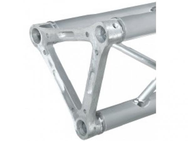 La struttura è in alluminio estruso AlMgSil avente denominazione EN AW 6082 T6 HB 90 (UNI 9006) con tubi correnti da 50mm di diametro e 2mm di spessore. Le diagonali interne sono di alluminio estruso P-Al-Mg-S con denominazione 6060 HB 60 (UNI 9006), con diametro da 20mm e spessore 2mm. I terminali (piastra) sono realizzati con una lega di alluminio GLASI 10 Cul. La soluzione della greca continua rende la struttura gradevole e ne consente l'impiego anche in ambienti di piccole dimensioni. La truss a sezione trio da 29cm presenta due tipi di connessione: una rapida con ogive, spine e molle (PLTSET02PLUS), l'altra con viti e dadi (PLTSET01M10).