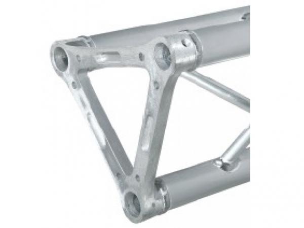 La struttura è in alluminio estruso AlMgSil avente denominazione EN AW 6082 T6 HB 90 (UNI 9006) con tubi correnti da 50mm di diametro e 2mm di spessore. Le diagonali interne sono di alluminio estruso P-Al-Mg-S con denominazione 6060 HB 60 (UNI 9006), con diametro da 20mm e spessore 2mm. I terminali (piastra) sono realizzati con una lega di alluminio GLASI 10 Cul. La soluzione della greca continua rende la struttura gradevole e ne consente l'impiego anche in ambienti di piccole dimensioni. La truss a sezione trio da 29cm presenta due tipi di connessione: una rapida con ogive, spine e molle (PLTSET02PLUS), l'altra con viti e dadi (PLTSET01M10).