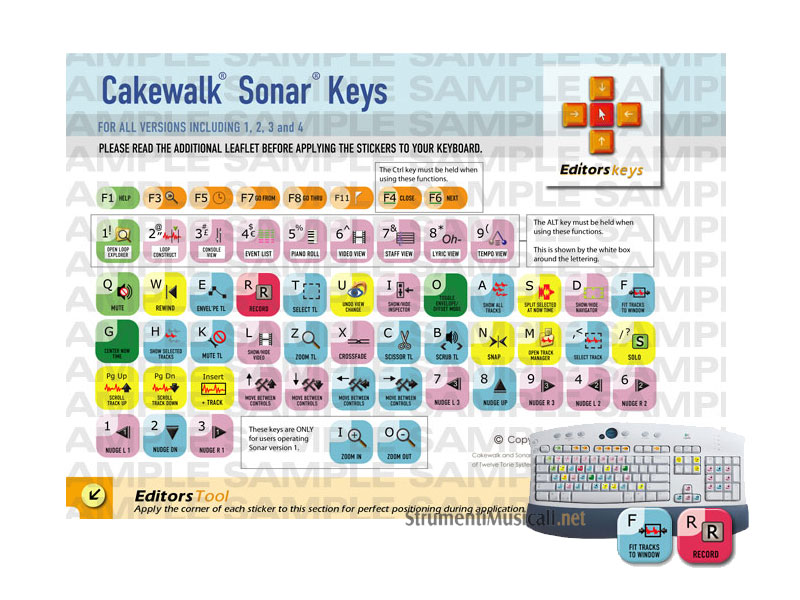 Questo set di adesivi trasformerà la tastiera del vostro personal computer in una tastiera per audio editing professionale per Sonar, ad un prezzo assolutamente irrisorio se paragonato ad altre soluzioni. Se avete sempre desiderato di riuscire a lavorare più velocemente ed in maniera più efficiente avendo quel "feel" da studio di registrazione professionale, allora non potete lasciarvi sfuggire questo prodotto!