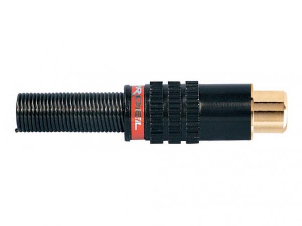 Presa volante RCA con contatti dorati. Realizzata con manicotto in alluminio nero e molla passacavo flessibile con diametro da 6,2mm.
