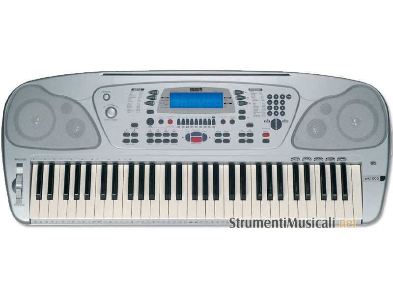 WK1000 è una tastiera con arrangiamenti automatici, facile da utilizzare e capace di adattarsi a diverse situazioni: dallo studio della musica al puro divertimento del karaoke. La generazione sonora interna mette a disposizione 471 suoni PCM (inclusi 20 drumkit) che permettono di ricreare tutte le sonorità utili per interpretare i più diversi generi musicali; il processore d'effetti interno offre la scelta tra 22 riverberi e 22 effetti con mandate separate, che arricchiscono e ottimizzano ulteriormente la sonorità generale. Con 32 note di polifonia massima, una multitimbricità a 16 parti, split programmabile, modalità Mono e funzione Layer tra due suoni, WK1000 permette di gestire con la massima libertà le numerose sonorità sulla tastiera, offrendo diverse soluzioni esecutive. I suoni e le impostazioni relative allo stato ed alla gestione delle singole tracce, per l'esecuzione in tempo reale e per l'utilizzo degli style, possono essere memorizzati all'interno delle 63 locazioni performance programmabili, le quali contemplano le programmazioni degli effetti, dei controller (pedali, Pitch/Modulation), dei canali MIDI, lo stato delle tracce (On/Off), il tempo e altro. In pratica, selezionando una performance vengono richiamati tutti i parametri e le impostazioni in essa memorizzati, premendo un semplice tasto. WK1000 mette a disposizione anche 96 style performance non modificabili, associate agli style della sezione di accompagnamento automatico; ogni style perfomance contiene i suoni più adatti per lo style selezionato. Inoltre, grazie alla funzione Single Touch Play, è possibile assegnare fino a 9 impostazioni Real Time (combinazioni di suoni delle sezioni Upper 1, Upper 2, Lower) che dipendono dallo style in uso. La sezione Arranger include gli accompagnamenti automatici, arrangiati da musicisti professionisti e che permettono di eseguire gli stili musicali più diffusi e utilizzati; è possibile scegliere tra 96 style differenti, ciascuno completo di sezioni Intro, Ending e di 4 variazioni che permettono di stabilire l'arrangiamento strumentale: dal più semplice al più elaborato. Ogni style è composto da 5 tracce ed è liberamente gestibile grazie a diverse funzioni e controlli sempre a portata di mano, tra cui i tasti Fill-in, il Fade, il KeyStart e il bilanciamento di volume tra il suono eseguito in real time sulla tastiera e le tracce dello style. Grazie al MIDI file player è possibile eseguire qualsiasi base musicale in formato Standard MIDI File (tipo 0, 1 e 1+lyrics), effettuando la lettura diretta da floppy disk; il sequencer interno è pratico e immediato e consente di registrare fino a 7 SongStyle facendo uso degli accompagnamenti. Il pannello di WK1000 è stato realizzato per avere ogni controllo sempre a portata di mano e per facilitare ogni operazione. Il display retroilluminato è ben visibile e fornisce sempre le informazioni necessarie in base all'ambiente operativo selezionato. La completa dotazione di connessioni presenti sul pannello posteriore include anche l'uscita video per il collegamento a TV per visualizzare gli accordi e i testi in modalità karaoke. L'efficace sistema di amplificazione incorporato riproduce l'ampia gamma dinamica e timbrica dello strumento con grande fedeltà.