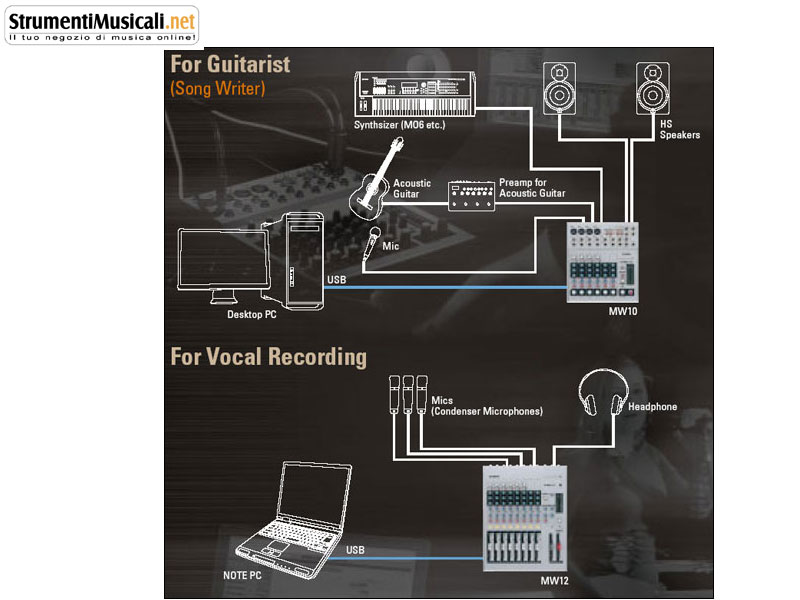 Se si dispone di un computer laptop o desktop, dei sistemi operativi Windows™ o Macintosh™ e si desidera utilizzarli per creare musica, ecco la configurazione adatta: la nuova serie di mixer MW USB Mixing Studio risponde a qualsiasi esigenza di questo tipo, trasformando il computer in uno studio di registrazione home completo, ricco di funzionalità e in grado di fornire prestazioni elevate. Il nuovo MX si avvale di una connessione = USB a cavo singolo per interfacciarsi con il computer e trasferire dati audio in entrambe le direzioni. In un minimo spazio di ingombro, offre caratteristiche complete di mixing e ingresso dei segnali. Inoltre, comprende il potente software per la produzione musicale Cubase AI4, che consente di catturare le performance, impreziosirle e migliorarle con effetti e sintetizzatori plug-in ed eseguirne il mixing in stereo. MW offre, in altre parole, tutti gli elementi di un sistema di registrazione, con caratteristiche di notevole facilità di configurazione e utilizzo.