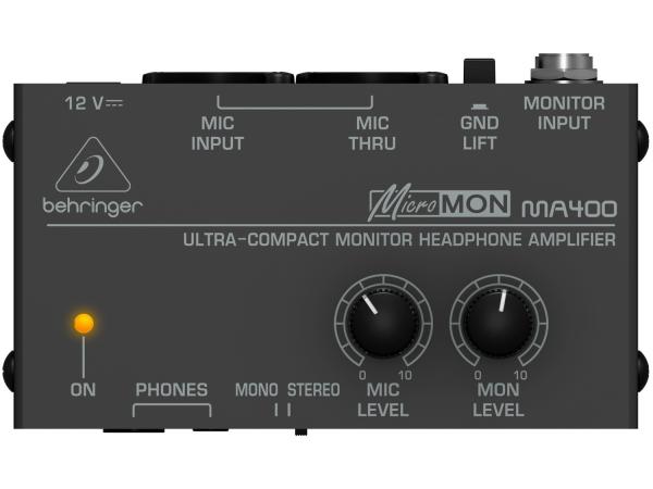 Il Behringer MA400 è dotato di XLR THRU jack e fornisce un eccellente funzionamento senza disturbi. Basta collegare il microfono al MIC INPUT e inviare una linea dal MIC THRU al mixer principale. È anche possibile utilizzare microfoni a condensatore di prima scelta, dato che l'MA400 fornirà alimentazione phantom +48V, se il mixer ne è dotato. Le prese PHONES accettano sia connessioni 1/4" che 1/8" per cuffie e auricolari rendendo l'MA400 ideale per IEM (in-ear-monitor) cablati, come ad esempio batteristi e tastieristi-cantanti. L'MA400 è dotato di alimentazione a 12V DC e di un LED per indicare quando è acceso. Essendo in grado di funzionare sia in stereo che mono, il MA400 è un mixer potente che vi permette di controllare due fonti indipendenti, un microfono e il monitor feed del tuo mixer principale.