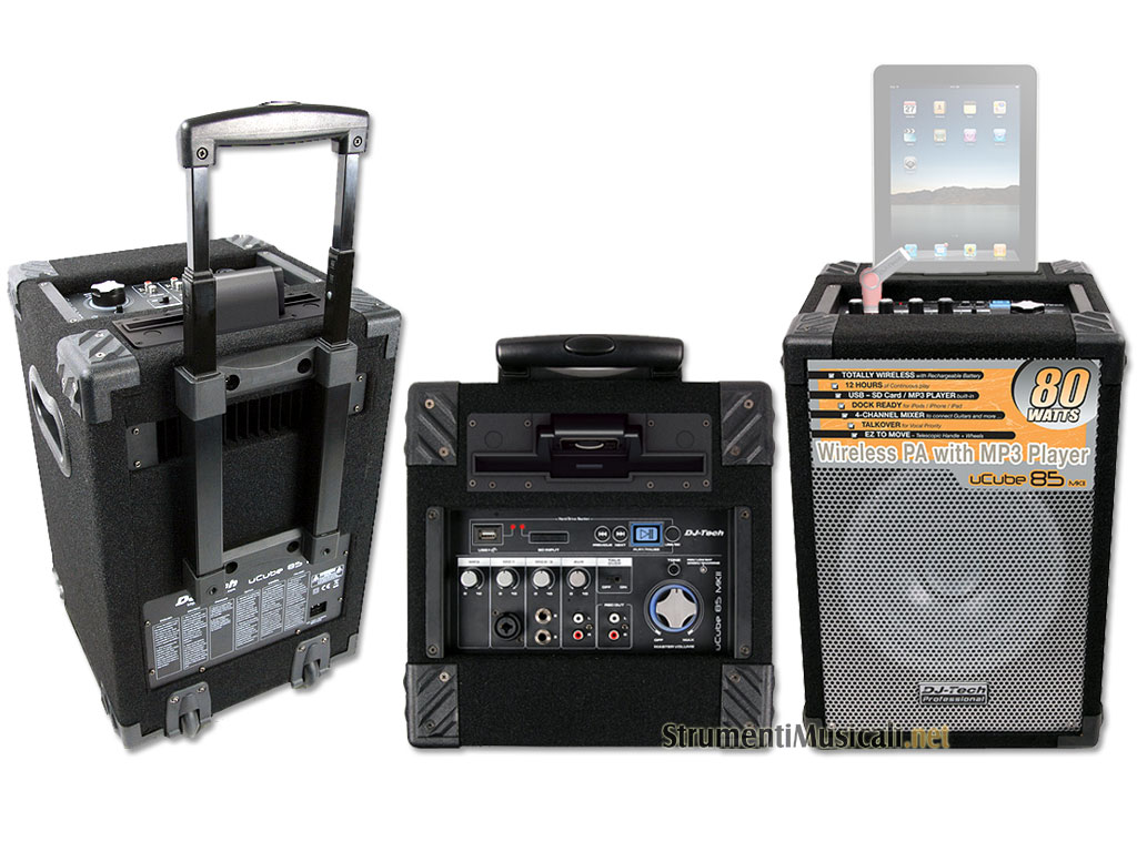 uCube 85 MKII è un sistema portatile PA 80 Watt per i musicisti itineranti, animatori, e coordinatori di eventi. Lo uCube 85MKII dispone di un mixer a 4 canali, lettore MP3 integrato e varie opzioni di connessione per dispositivi esterni. Lo uCube 85MKII fornisce ingressi per schede SD, thumb drive USB per la riproduzione di file MP3. Per le performance vocali, lo uCube 85 MKII offre un jack combo per microfono con funzione Talkover. Lo uCube 85 MKII dispone anche di una batteria ricaricabile integrata e maniglia telescopica retrattile per consentire un facile trasporto. Goditi un audio eccellente, lettore MP3 integrato, e un mixer completo di tutto in un unico apparecchio con il DJ Tech uCube 85 MKII.