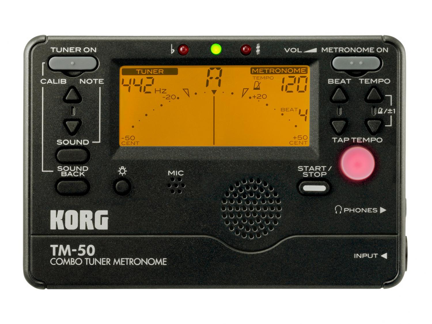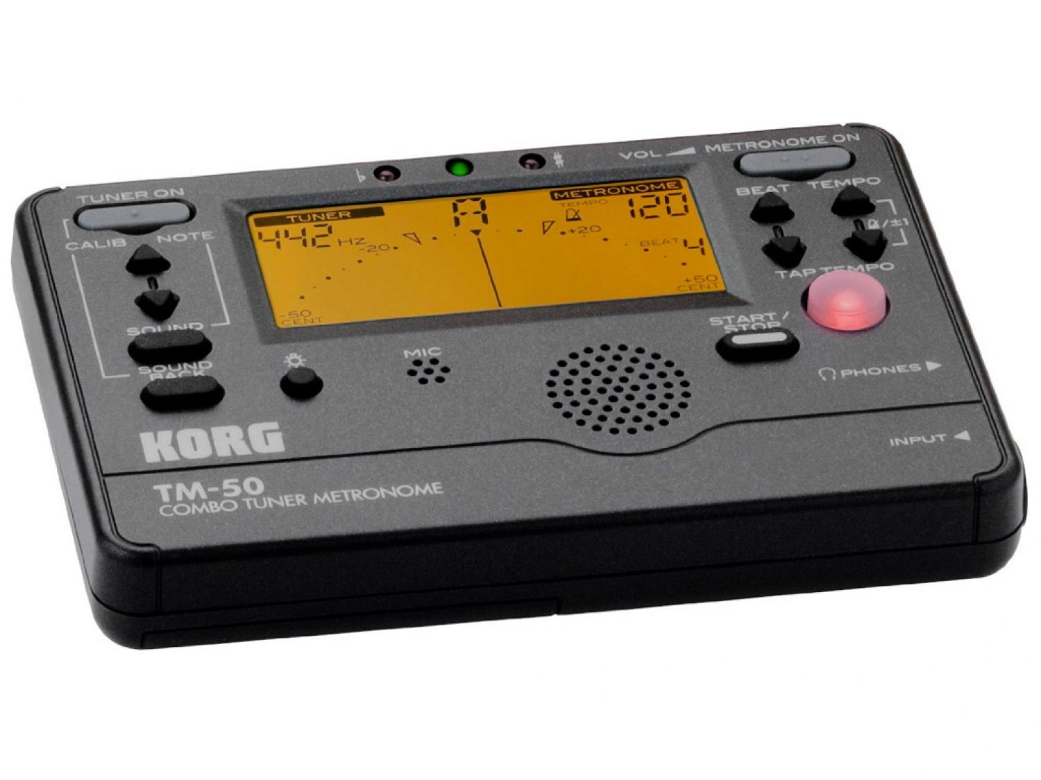 Il TM-50 è il nuovo prodotto di casa Korg Tuners che presenta funzioni di accordatore e metronomo che possono essere utilizzati contemporaneamente o in modo indipendente. Di nuova concezione, con display LCD altamente reattivo con lancetta tipo ago per indicare in maniera precisa la calibrazione, ampio campo di rilevamento da C1 a C8. Suono che riproduce un tono di riferimento in tre ottave udibile grazie all'altoparlante in dotazione. La calibrazione supporta una vasta gamma di pitch, con indicazione anche di intervalli di terza maggiore e minore. Vasta gamma di tempo 30-252 battiti / minuto, 15 ritmo variazioni. Impostazioni Easy Tempo con due tipi di patterns tempo più una funzione tap tempo. LCD di grandi dimensioni con retroilluminazione regolabile su due livelli per una migliore visibilità, backup di memoria e spegnimento automatico.