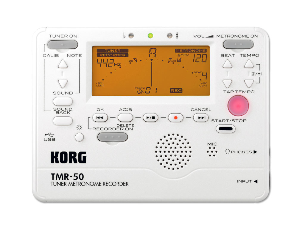 La popolare serie Korg TM di Accordatori/Metronomi è amata dai musicisti che si esercitano per perfezionare le loro abilità musicali. Ora la TMR-50 aggiunge la funzionalità del registratore alla lista già impressionante di funzioni. Un modo estremamente prezioso per migliorare la vostra abilità è quello di identificare le aree problematiche che hanno bisogno di lavoro, e poi l' esercizio per migliorare quelle aree. Con il suo microfono e altoparlante integrati, il TMR-50 rende facile tutto ciò. Offre una alta qualità di registrazione PCM lineare e una porta USB per l'utilizzo con il computer.