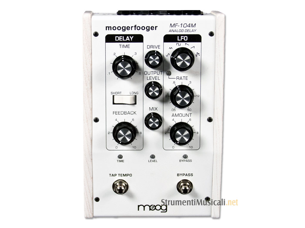 Il classico Moog Analog Delay è tornato e nella sua versione migliore di sempre. La primissima versione risale al 2000, quando la versione Classic MF-104 Analog Delay fu prodotta in un'edizione limitata di sole 1000 unità. Per quella versione fu utilizzata una versione particolare del chip per delay "Bucket Brigade" per mantenere l'effetto completamente analogico. Sfortunatamente, la fornitura di questo tipo di chip fu estremamente limitata e già nel 2001 si esaurì la produzione. Moog Music qualche anno dopo è poi riuscita a ritrovare un'altra scorta di chip che ha consentito la produzione, naturalmente sempre in serie limitatissima, delle due edizioni speciali MF-104SD e MF-104Z. Questi delay, insieme all'originale MF-104, sono diventati tra i più ambiti e ricercati Analog Delay della storia. Il nuovissimo MF-104M ricrea suono e vibrazioni del primo modello Classic MF-104 con alcune nuove caratteristiche davvero molto rilevanti. Utilizza gli stessi chip vintage Bucket Brigade del Classic che garantiscono 800ms del miglior "all analog" delay attualmente sul mercato. Il nuovo MF-104M suona in modo fantastico e, come tutti i Moogerfooger, ha dei controlli che consentono di modellare con una varietà infinita di modulazioni possibili solo con un Moogerfooger. Moog ha aggiunto funzioni come il MIDI e il Tap Tempo. Inoltre il nuovo modello include anche la modalità 'Spillover' del precedente MF-104Z che consente di disattivare l'effetto senza tagliare il decadimento naturale delle ripetizioni. Il selettore aggiuntivo sul pannello consente di attivare o disattivare la modalità Spillover.