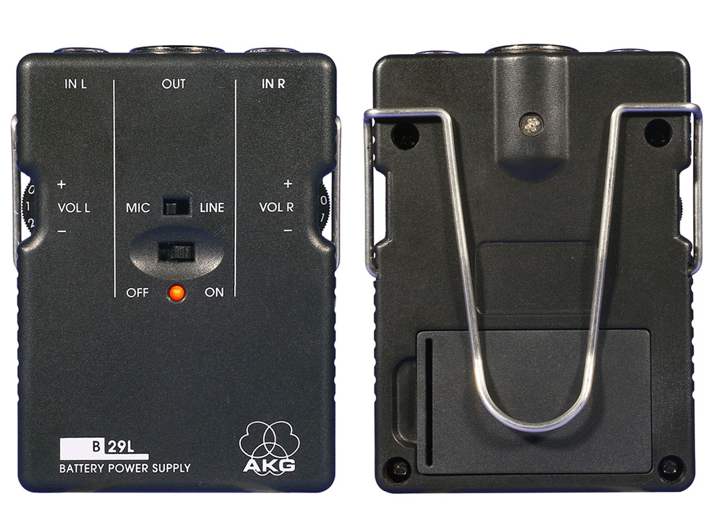 L' AKG B29L permette di alimentare uno o due microfoni della serie MicroMic III C4..L. Il B29L è dotato di un interruttore On/Off e LED di stato, nonché di un selettore mic/line per adattare il livello di uscita all'ingresso di mixer, registratori, ecc. Il B29L funziona con una batteria standard da 9V (durata media della batteria di 50 ore). Due controlli di volume consentono di bilanciare i livelli dei due microfoni. Una clip in dotazione rende facile collegare il B29L alla cintura o ad una chitarra.