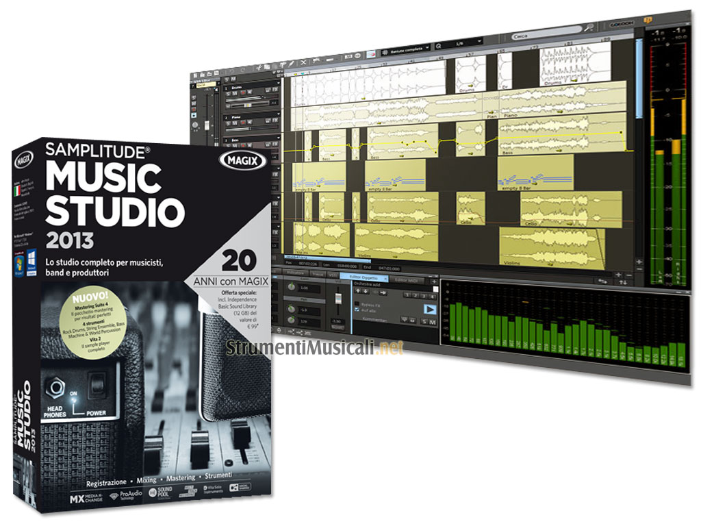 Samplitude Music Studio 2013 ti offre tutto il necessario per le tue produzioni musicali. A casa, in sala prove o in studio. Questa combinazione esclusiva di gestione intuitiva e strumenti studio professionali, vari strumenti musicali ed effetti high-end offre un ambiente creativo ottimale per i tuoi progetti musicali nel tuo studio audio personale - dalle registrazioni a più tracce, elaborazione e composizione audio, sound design e missaggio fino alla masterizzazione e alle pubblicazioni.