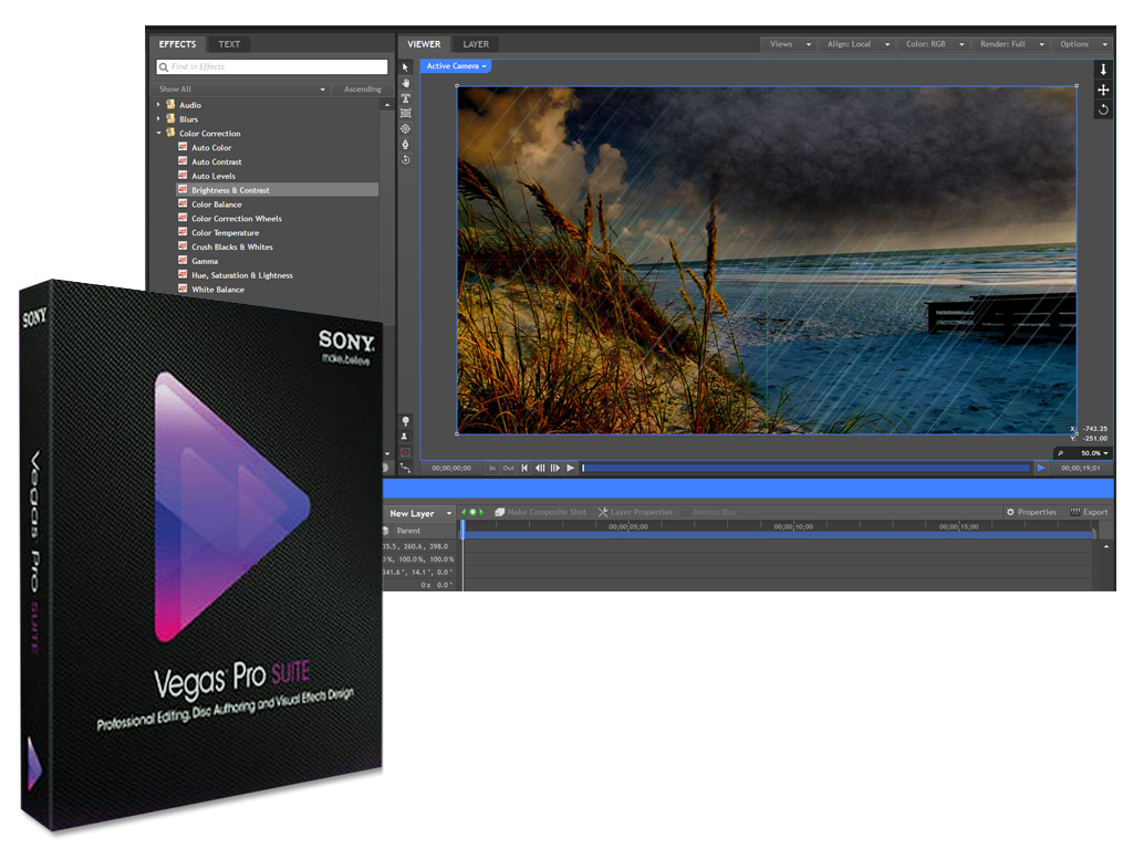 • Potenti effetti visivi e compositing: Combina fino a 32 effetti di alta qualità, keyframabili, in Vegas Pro e applicali ai livelli Event, Track, Media o Project. Invia i file multimediali dalla timeline di Vegas Pro a HitFilm Ultimate, in cui è possibile aggiungere simulazioni 3D di particelle, generatori di distruzione dinamica, effetti di luce e lenti, composizione 2D/3D utilizzando modelli 3D e videocamere 3D