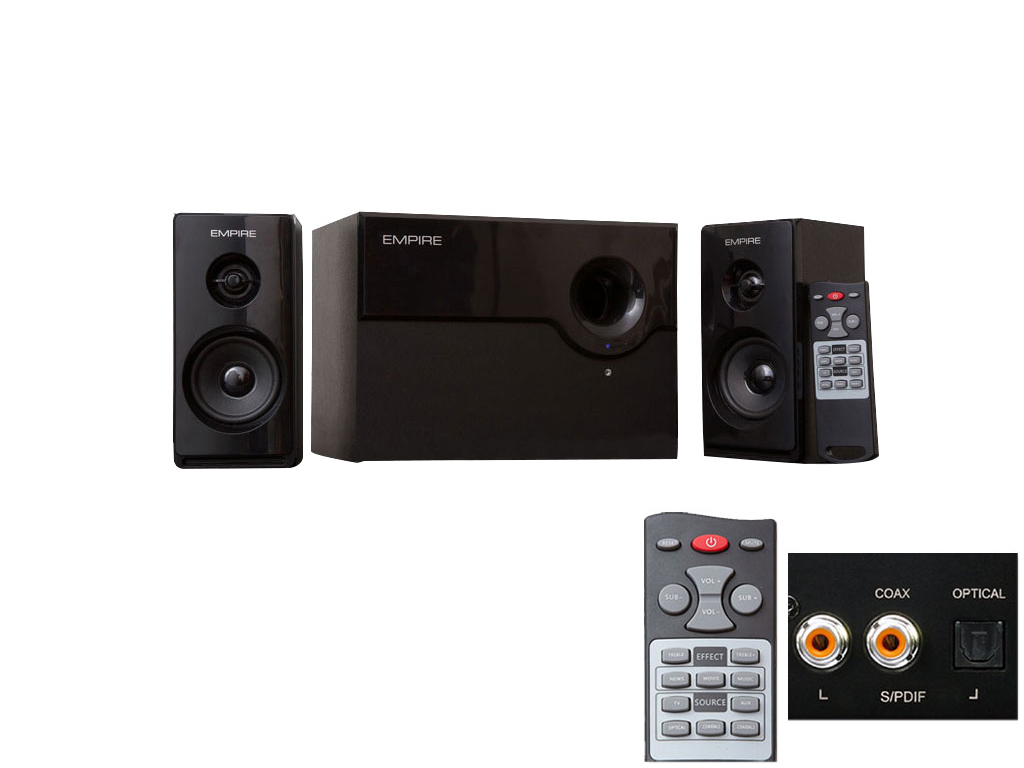 Le Empire EMPIRE KS-3500D sono un sistema 2.1 di elevata potenza (80 Watt), ideale per TV, Decoder Satellitari e Digitali Terrestri, PC, Notebook e Gaming Console. 3 ingressi Digitali (1 Ottico e 2 Coassiale SPDIF). 2 ingressi RCA Stereo Analogici. Riproduzione fedelissima dall'eccezionale qualità sonora. Telecomando wireless con controllo Volume, Bassi, Acuti, selettore delle Sorgenti e Preset sonori per le diverse esigenze. Subwoofer da 5,25" a bobina rinforzata con cabinet in legno. Satelliti a due vie, ideali per riprodurre un ampio range di frequenze che parte dai mediobassi fino alle frequenze più elevate. L'amplificatore possiede un tempo di risalita "velocissimo" che permette di riprodurre fedelmente i picchi della musica e tutti gli effetti sonori, anche quelli con brusche variazioni di frequenza. Driver magneticamente schermati per evitare qualsiasi disturbo o distorsioni sui monitor.