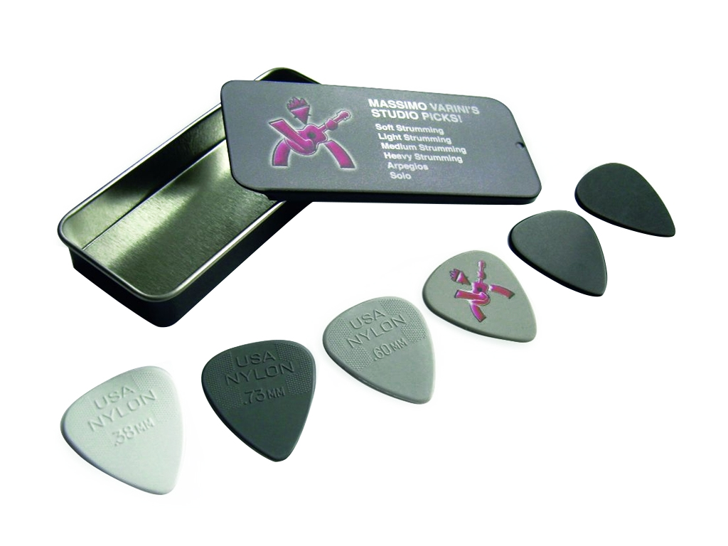 Tin Box ideato da Massimo Varini contenente plettri di materiali e spessori diversi. La selezione di questi plettri risponde all'idea che differenti qualità e spessori sono da utilizzarsi su contesti di accompagnamento o solista diversi.