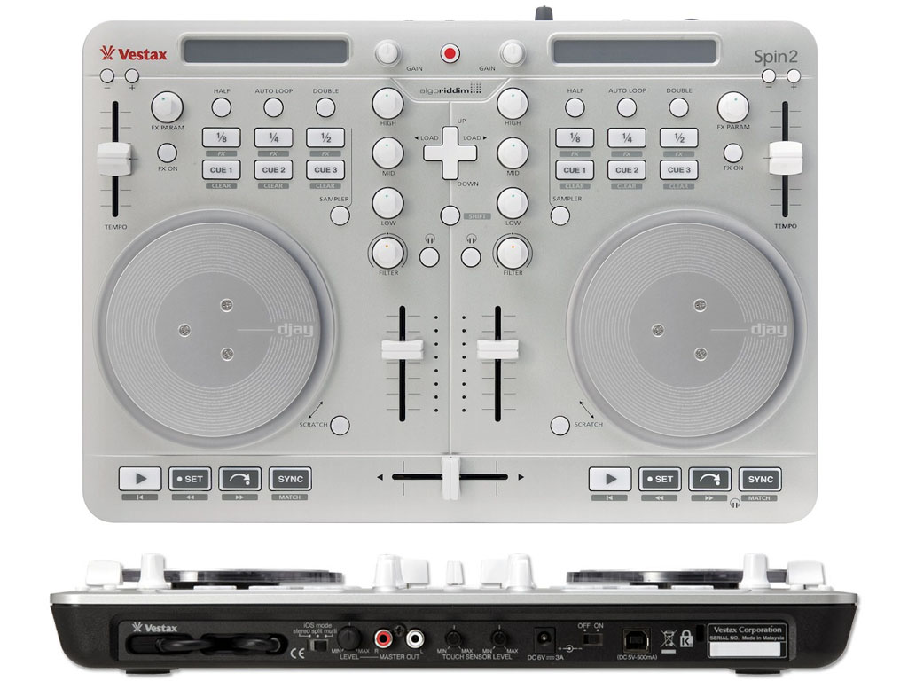 Spin2 è il nuovo DJ controller "all-in-one" a 2 canali progettato da Vestax in cooperazione con Algoriddim, i noti creatori delle popolari app per DJ come Vjay. Spin2 è in configurazione plug&play: basta collegarlo e impiegare qualsiasi app di Algoriddim, senza perdersi in complicati menu e settaggi. Lo colleghi e puoi immediatamente mixare brani da iTunes ma anche video dalle librerie media. Spin2 viene proposto in bundle con il software DJay per Mac e si avvantaggia al massimo di tutte le sue caratteristiche essenziali, a partire dal layout estremamente funzionale già molto apprezzato dal mercato. Il DJ riesce ad accedere velocemente alle porzioni delle song grazie al controllo "Touch Strip", e compiere al volo moltissime operazioni, come saltare velocemente ai punti di cue, innescare loop, aggiungere effetti, suonare campioni, fare scratch con le jog wheel, sincronizzare istantaneamente il BPM delle song e poi registrare tutti i mix in uscita dal suo Spin2. Spin2, inoltre, supporta completamente le nuove caratteristiche audio multi-canale e multi-route dell'ultimo sistema operativo iOS 6 di Apple.