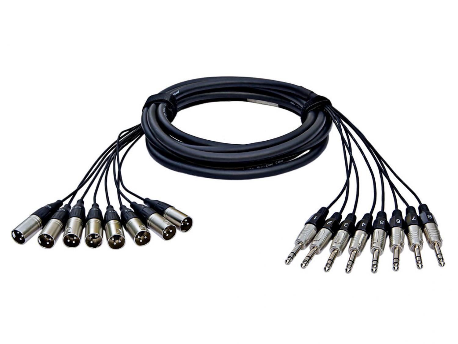 Cavo multicore per connessioni analogiche 8 canali con 8 connettori jack TRS M ed 8 XLR M con shell in metallo per una messa a terra ed una RF rejection migliori.