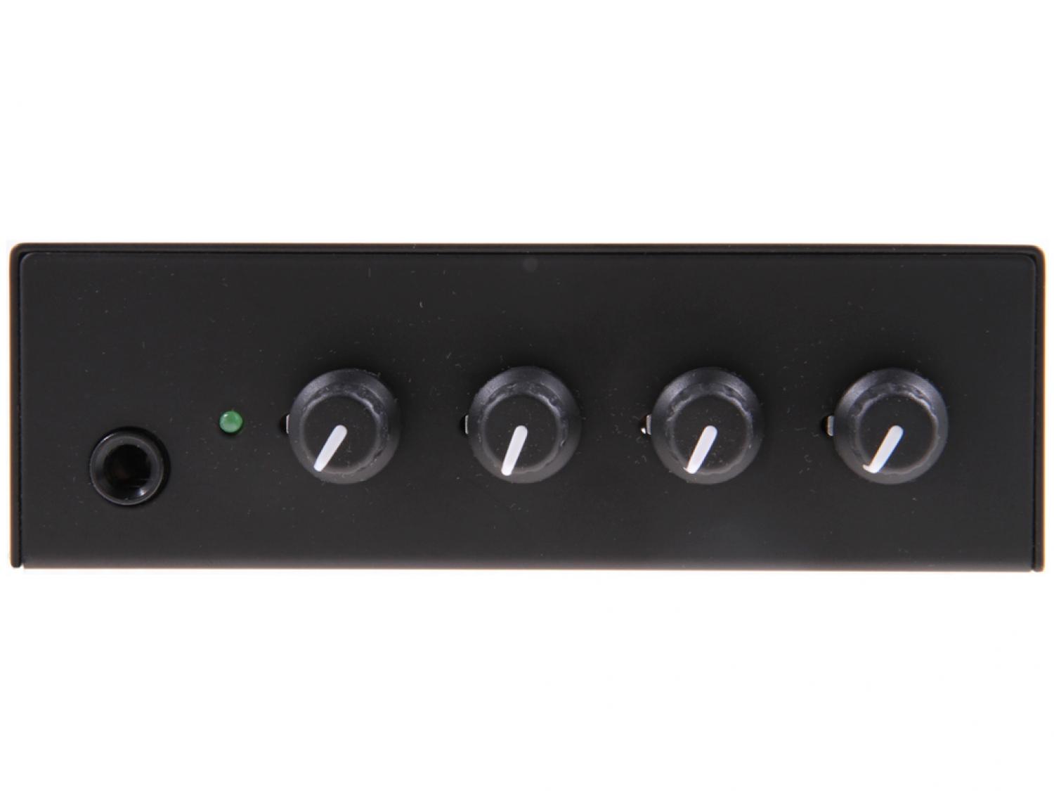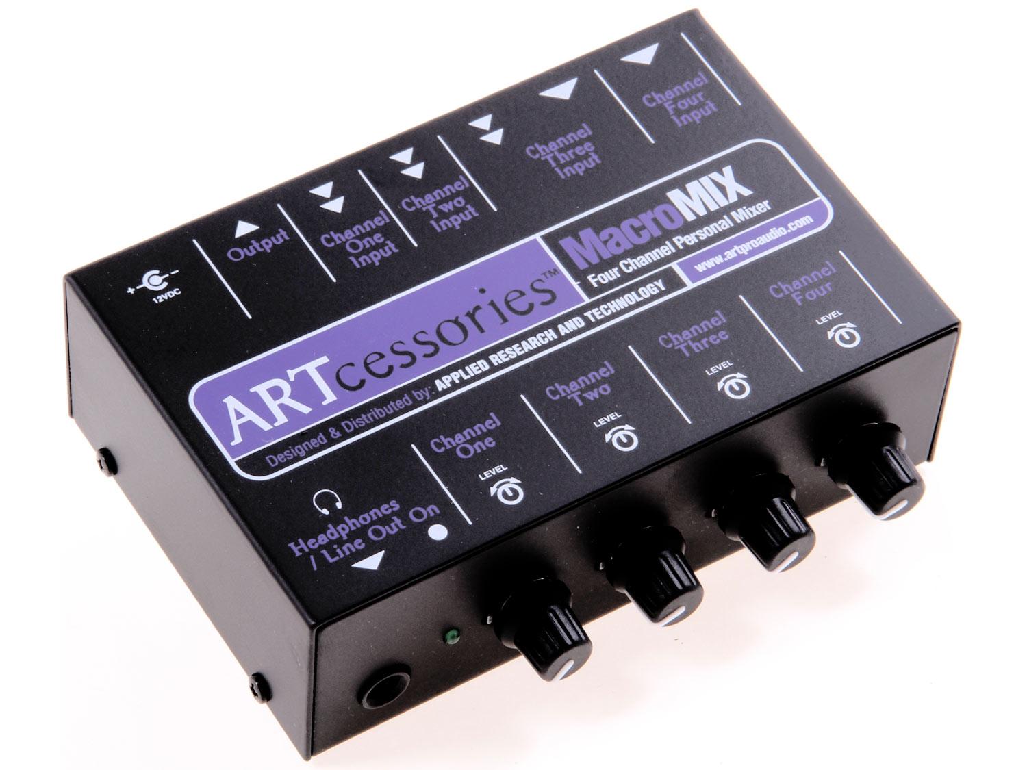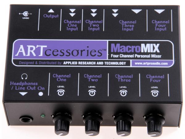 Il MacroMIX è un mixer da quattro canali di linea, ciascuno dotato di un controllo di volume indipendente. Questa unità dispone di due ingressi jack 1/4", tre set di ingressi RCA stereo (che vengono mixati in mono) e un abbondante guadagno per il vostro finale di potenza. La sezione d'uscita offre due uscite mono RCA e un'uscita jack 1/4". Il MacroMIX è alimentato da un alimentatore esterno da 12V DC.