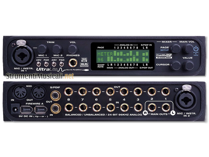 La scheda audio FireWire UltraLite, alimentabile dal bus FireWire, offre tutto ciò che serve per convertire il proprio portatile o desktop Pc o Mac in uno studio di registrazione mobile a 24-bit/96kHz con 10 ingressi e 14 uscite. Grazie alla possibilità di alimentare la scheda dal bus FireWire, la UltraLite offre la massima libertà per poter creare musica in qualsiasi momento e luogo. Alloggiata in una struttura in alluminio robusta, ma allo stesso tempo leggera, la UltraLite offre 2 ingressi microfonici/strumentali con pre-amplificatore, alimentazione phantom 48V, regolazione del gain sul pannello anteriore ed un interruttore a tre vie per il pad. La scheda offre anche altri 6 ingressi bilanciati line su Jack TRS (per un totale di 8 ingressi analogici) e 10 uscite analogiche. Sono inoltre presenti: S/PDIF digitale stereo I/O, un'uscita cuffie stereo e MIDI I/O. La UltraLite consente di connettere tutta la strumentazione da studio, compresi microfoni, chitarre, synth, tastiere, drum machine e processori d'effetti per monitorare tutto tramite l'uscita main, l'uscita cuffie o qualunque altra uscita senza alcuna latenza o sovraccarico delle risorse del computer. È anche possibile creare dei mix separati per le diverse uscite. Dal software di gestione CueMix è possibile gestire le connessioni ed il monitoraggio come su una console da studio. È anche possibile utilizzare la UltraLite per mixare senza il computer, controllando il CueMix direttamente dal pannello frontale. L'UltraLite include un'interfaccia MIDI a 16-canali. È sufficiente connettere il cavo FireWire e audio e MIDI saranno pronti all'uso. La UltraLite è compatibile con Mac OS X 10.3 o successivo, Windows XP e tutti i principali software audio grazie ai driver WDM/ASIO/Core Audio.