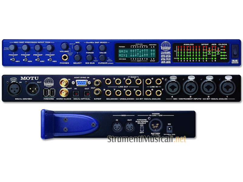 La Traveler offre tutto ciò che serve per convertire il proprio computer in una workstation audio digitale mobile a 24-bit, 192kHz. La Traveler offre otto canali di riproduzione e registrazione a 192kHz e tutte le connessioni digitali principali: ADAT ottico, AES/EBU ed S/PDIF (TOSLink ed RCA). È inoltre possibile espandere il sistema aggiungendo altre interfacce FireWire come un'altra Traveler, una 828 o una 896. I quattro pre-amplificatori microfonici/strumentali sono dotati di alimentazione phantom 48V individuale e controlli di Trim digitali, regolabili dal pannello frontale o dal software di gestione CueMix Console. Grazie al CueMix DSP, il mixer digitale a 8 bus a latenza zero della Traveler, non è necessario l'utilizzo di alcun mixer. È possibile connettere qualunque tipo di strumentazione da studio: microfoni, chitarre, synth, tastiere, drum machine o processori d'effetti e monitorare il tutto tramite le uscite main, l'uscita cuffie o qualsiasi altra uscita - senza alcuna latenza o sovraccarico del processore. È addirittura possibile creare mix di monitoraggio separati per l'uscita, le cuffie e le altre uscite e gestire il tutto tramite il software CueMix Console o direttamente dal pannello frontale della Traveler. È possibile utilizzare la Traveler come mixer stand-alone e modificare il mix al volo tramite i controlli del pannello anteriore e l'LCD retro-illuminato. In studio è possibile montare la Traveler a rack tramite gli adattatori inclusi. Gli otto canali ADAT ottici I/O consentono di collegare la Traveler comodamente ad una console digitale. La connessione ADAT lightpipe supporta frequenze di campionamento fino a 96kHz. La Traveler include un'interfaccia MIDI a 16-canali. È sufficiente connettere il cavo FireWire e audio e MIDI saranno pronti all'uso. La Traveler è compatibile Mac OS X (10.2.3 o successivo), Windows Me/2000/XP e con tutti i software audio via WDM/ASIO/Core Audio driver. Ingressi ed Uscite Tutti gli ingressi e le uscite sono discrete e attive in simultanea. Ad esempio, un ingresso microfonico è indipendente rispetto all'ingresso corrispondente TRS. Le cuffie e l'uscita main possono essere gestite come destinazioni di mixaggio differenti.