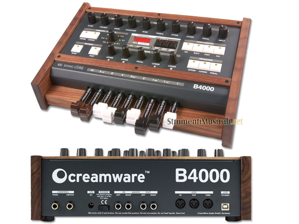 Dopo l'acclamato successo del B2003, la Creamware è lieta di annunciare la relativa versione hardware denominata B4000 ASB. Ora tutti i controlli del mitico Hammond B3 saranno disponibili per ricreare fedelmente i fantastici suoni del suo predecessore e con una drastica riduzione di peso ora potrai portare il tuo organo ovunque vorrai. Ogni singolo elemento del circuito elettromeccanico è stato emulato alla perfezione per un incredibile feeling! Inoltre tramite la connessione USB è anche possibile gestire totalmente il B4000 tramite il vostro computer grazie ad un software di controllo incluso.