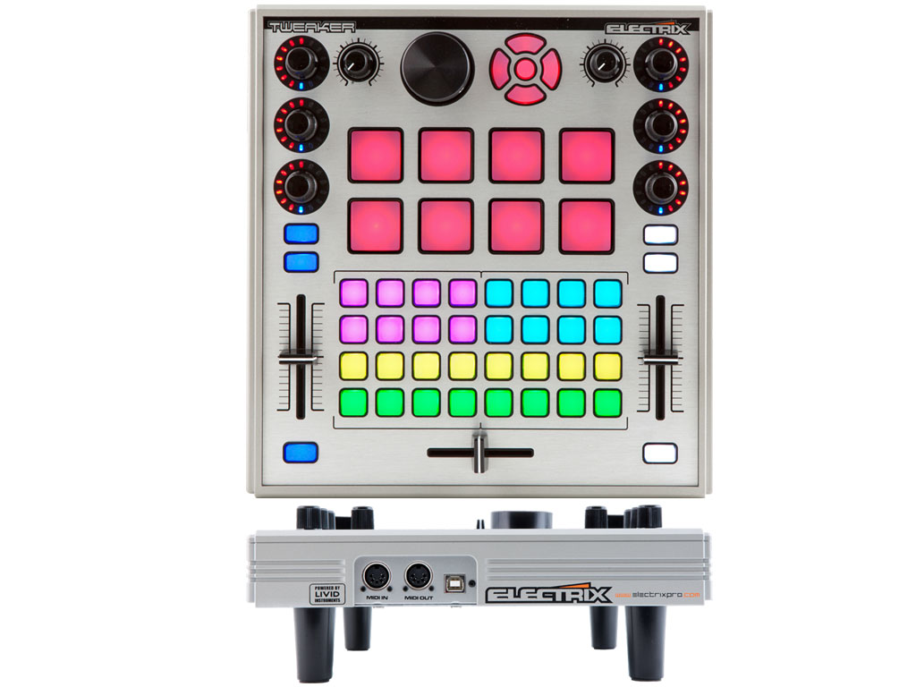 L'Electrix Tweaker è un controller MIDI in stile DJ che funziona con software MIDI compatibile. Raggruppando una vasta gamma di elementi di controllo in un design compatto, la superficie di controllo include una griglia di 32 pulsanti, pad sensibili alla velocity, push encoder con anelli a LED, in un'interfaccia in stile mixer DJ a 2 canali, con feedback super luminoso a LED multicolore. Il layout compatto e intuitivo è adatto per lo studio, il palco, e la cabina DJ. Usalo come controller DJ principale o come un add-on per qualsiasi setup. Ha gambe smontabili incluse per abbinarsi ai tradzionali strumenti perDJ. Con le gambe il Tweaker è alla stessa altezza di giradischi e mixer per DJ per l'utilizzo con sistemi DVS qiuali Traktor Scratch e Serato Scratch Live. Il Tweaker è completamente alimentato tramite USB ed è USB Class Compliant con Mac OS e Windows. Una serie supplementare di porte MIDI I / O consentono di collegarlo ad altri dispositivi. La superficie di controllo è ideale anche per altre applicazioni MIDI compatibili come Video o il controllo delle Luci. Tweaker include Traktor LE 2 con overlay, Ableton Live Remote Script per il supporto nativo del controller (con overlay incluso), mappature Traktor Pro 2 e Serato Scratch Live, più il software Tweaker Editor che per la personalizzazione delle impostazioni e la creazione di preset.