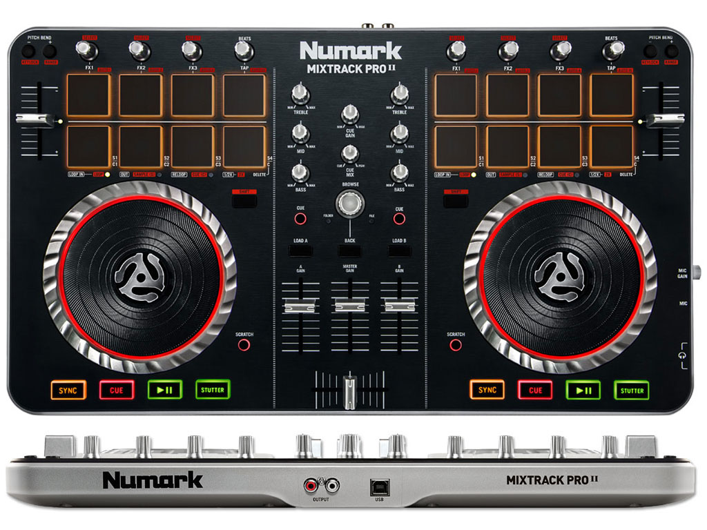 Il Mixtrack Pro II offre un layout potenziato e arricchito di numerosi nuovi controlli, come i 16 pad retroilluminati e le due wheel, anch'esse illuminate e sensibili al tocco. Presenti anche vari potenziometri e pulsanti per la gestione degli hot-cue, dei loop e degli effetti. Gli 8 pad retroilluminati disponibili su entrambi i deck funzionano in multi-layer, per consentire la gestione di più funzioni. Sarà possibile passare dalla modalità loop a quella sampler, oppure gestire fino ad 8 punti hot cue. La sezione centrale del controller fornisce un layout in stile mixer due canali, con EQ 3-bande, 2 fader per il controllo del volume dei deck, un fader centrale per la regolazione del Master e un crossfader. Non manca una sezione per la ricerca e il caricamento delle tracce dal browser del vostro software preferito. I deck per il controllo delle tracce montano due nuove wheel retroilluminate sensibili al tocco dual-zone, per la ricerca del punto di CUE e/o il Pitch Bending, con funzione skratch attivabile mediante un pulsante dedicato, fader per il controllo del pitch (velocità), e i tasti di trasporto cue, play/pause, stutter ai quali si aggiunge il tasto Sync. La gestione degli effetti è affidata ai 4 potenziometri. L'interfaccia audio integrata rende il Numark Mixtrack PRO II una console pronta all'uso e completa per chi utilizza il computer nelle proprie performance DJ. Presente anche un ingresso microfonico. Numark MixTrack PRO 2 non necessita di driver. Compatibile con tutti i software di mixaggio (Virtual DJ, Traktor Pro, Serato DJ, ecc.), con il Mixtrack PRO II viene fornito i software Serato DJ Intro.