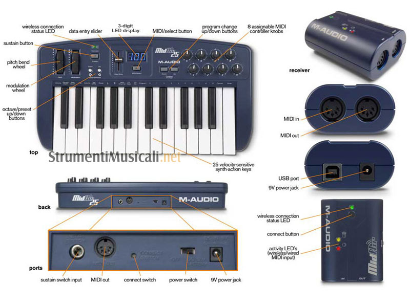 • ricevitore MidAir dotato di porta USB 1.1 e ingresso/uscita MIDI, alimentazione via bus USB o alimentatore c.c. opzionale