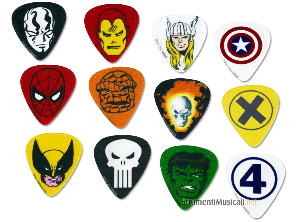 Il kit di plettri Peavey Classic Marvel Heroes include 12 plettri medium con i seguenti personaggi: Capitan America, Fantastici Quattro, X-Men, Spider Man, Iron Man, La Cosa, Hulk, Punisher, Thor, Wolverine, Silver Surfer, Ghost Rider.