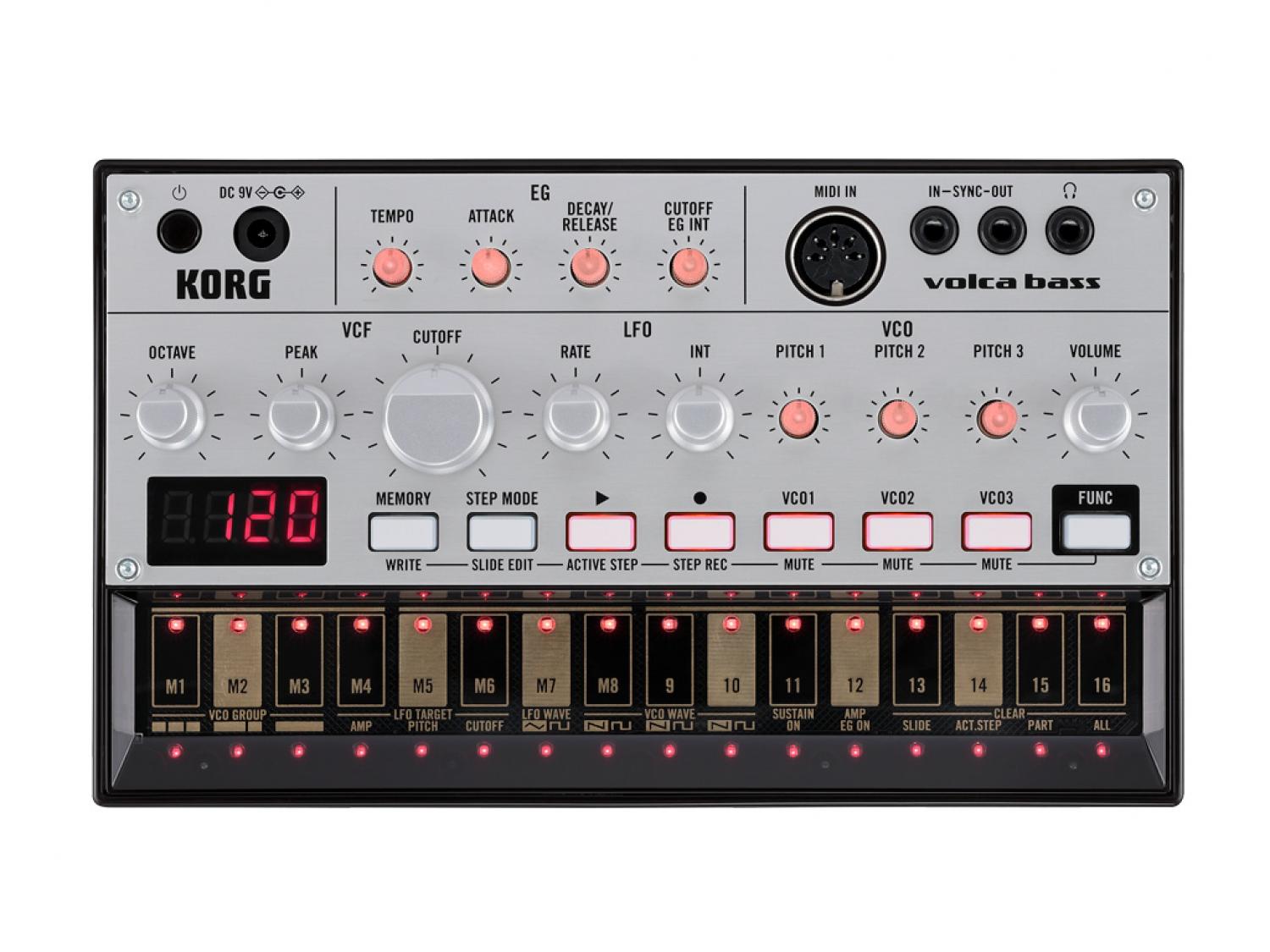 Il Korg Volca Bass è un sequencer analogico per basso di ispirazione Electribe, proposto in un formato compatto. Traendo ispirazione dal Korg Monotron e dalla gamma Monotribe, il Volca Bass si occupa della basse frequenze della nuova serie Korg Volca. Dotato di tre oscillatori, un generatore di inviluppo, un filtro di nuova concezione, un VCA e un LFO, il Volca Bass utilizza un'architettura semplice, con una miriade di opzioni per la creazione di un singolo suono. Il Volca Bass può anche essere collegato e controllato da una DAW via MIDI. I tre oscillatori analogici possono essere utilizzati all'unisono per generare ricchi suoni modulati, o regolati per fare accordi a 3 voci, ciascuna sequenziabile in modo indipendente per creare frasi complesse e in continua evoluzione. Se utilizzati insieme, i tre oscillatori possono essere leggermente discordanti per suoni corposi. Il Volca Bass utilizza un nuovo circuito di filtro sviluppato appositamente per le basse frequenze che offrono un suono nitido e più brillante quando completamente aperto, ampio e rotondo quando il cut off è ridotto. Korg ha incluso anche un controllo della risonanza e la possibilità di portare il filtro in distorsione, perfetto per linee di basso acide. La sezione sequencer del Korg Volca Bass è un diretto discendente dell'Electribe rendendo più semplice aggiungere o rimuovere notazioni al volo. Ci sono 16 tasti facili da usare che consentono di inserire singole note, mentre si ottiene un feedback a LED dalla posizione nella sequenza. È possibile anche inserire note in tempo reale utilizzando la tastiera del touch panel e si possono memorizzare nella memoria interna fino a otto modelli di sequenze.