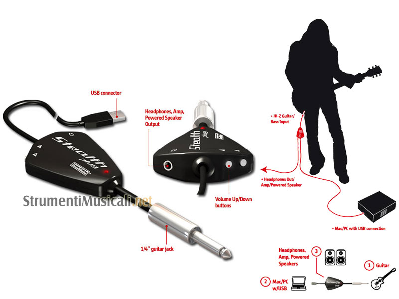 StealthPlug è il primo "cavo USB" per chitarra, un modo semplicissimo per poter collegare la vostra chitarra o basso al PC o al MAC (sono supportati anche i nuovi sistemi intel). Potrete iniziare immediatamente a suonare e registrarvi con il vostro PC grazie ai 6 software inclusi, proprio come se foste collegati ad un amplificatore o ad un multieffetto di ultima generazione e ad un registratore, con qualità altamente professionale. In bundle troverete una soluzione plugin standalone per chitarra e basso per suonare live ed esercitarvi, un software completo di registrazione, 2 effetti e plugin ed un gran numero di campionamenti e loop. Le sue dimensioni ridotte e la praticità di poter suonare anche in cuffia ad alta qualità lo renderanno uno strumento per voi indispensabile.
