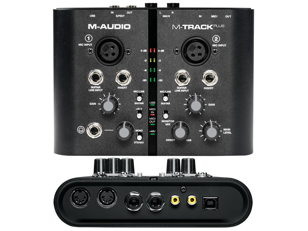 La nuova interfaccia M-Track Plus di M-Audio trasforma il tuo computer laptop o desktop in uno studio di registrazione digitale plug-and-play con qualità sonora 24-bit/48 kHz. M-Track Plus è dotata di molteplici connessioni di ingresso in grado di fornire i migliori risultati con qualsiasi tipo di sorgente audio. Ciascun canale dispone di un ingresso XLR e jack bilanciato da 1/4": l'ingresso XLR è pensato appositamente per l'utilizzo con microfoni o altre fonti di tipo Lo-Z. L'apposito interruttore phantom 48V eroga l'alimentazione per microfoni professionali a condensatore. L'ingresso jack da 1/4" può ricevere segnali a livello di linea come sintetizzatori, e drum machine, o di tipo strumento come chitarra e basso elettrico. La manopola del guadagno su ciascun canale, garantisce il corretto livello di ingresso. In aggiunta, i pratici connettori Insert, solitamente presenti in costosi preamplificatori da studio, possono essere utilizzati per inserire processori di effetti esterni come compressori, equalizzatori ed altri, durante la registrazione. M-Track Plus consente il monitoraggio dei segnali in ingresso con latenza zero, sia sulle uscite analogiche che in cuffia. Grazie all'apposita manopola MONITOR MIX che regola il bilanciamento tra il segnale proveniente dagli ingressi e l'audio in riproduzione dal vostro software, e l'uscita cuffie con controllo del volume indipendente, sarà più facile ottenere registrazioni migliori. E'dotata di ingresso e uscita MIDI con 16 canali contemporanei di I/O, perfetti per il collegamento di master keyboard o sintetizzatori hardware. Gli indicatori di livello multicolore di M-Track Plus forniscono un riferimento visivo immediato dei segnali di uscita.