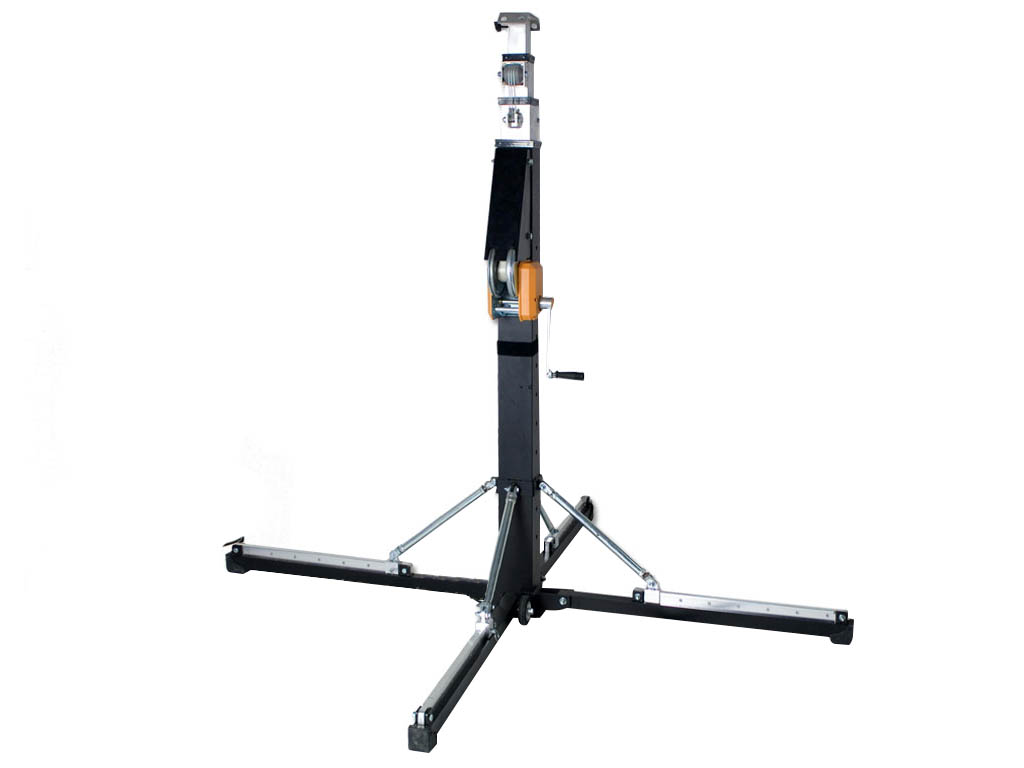 Elevatore telescopico in alluminio, di facile trasporto e di rapido impiego anche su superfici irregolari. Ha un peso ridotto rispetto ad altri prodotti costruiti in ferro. Il sistema di elevazione è composto da un verricello con trascinamento a cinghia per una corsa morbida e fluida. Ognuno dei tre stadi superiori scorre su guide autolubrificanti ed è trascinato da 3 funi ciascuno. I piedi della base hanno ciascuno un'ampia regolazione indipendente che rende più agevole il posizionamento anche su superfici inclinate o irregolari.