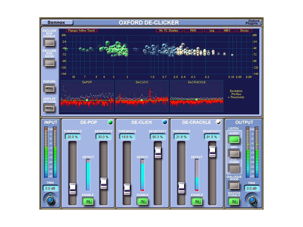 Ora è possibile mettere a riposo quei clic fastidiosi con l'incredibile Sonnox DeClicker plug-in. Questo strumento di restauro dispone di tre diverse sezioni, ognuna con soglie e controlli individuali: Depop, DeClick e DeCrackle. Un utile display ti tiene in contatto con la forza e la durata degli eventi rilevati. È anche possibile utilizzare una casella Exclude per mantenere intatti certi eventi, individuando al contempo gli altri. Precedentemente disponibile solo con il bundle Sonnox Restore, la potenza di DeClicker ora è disponibile singolarmente per VST, AU, RTAS.