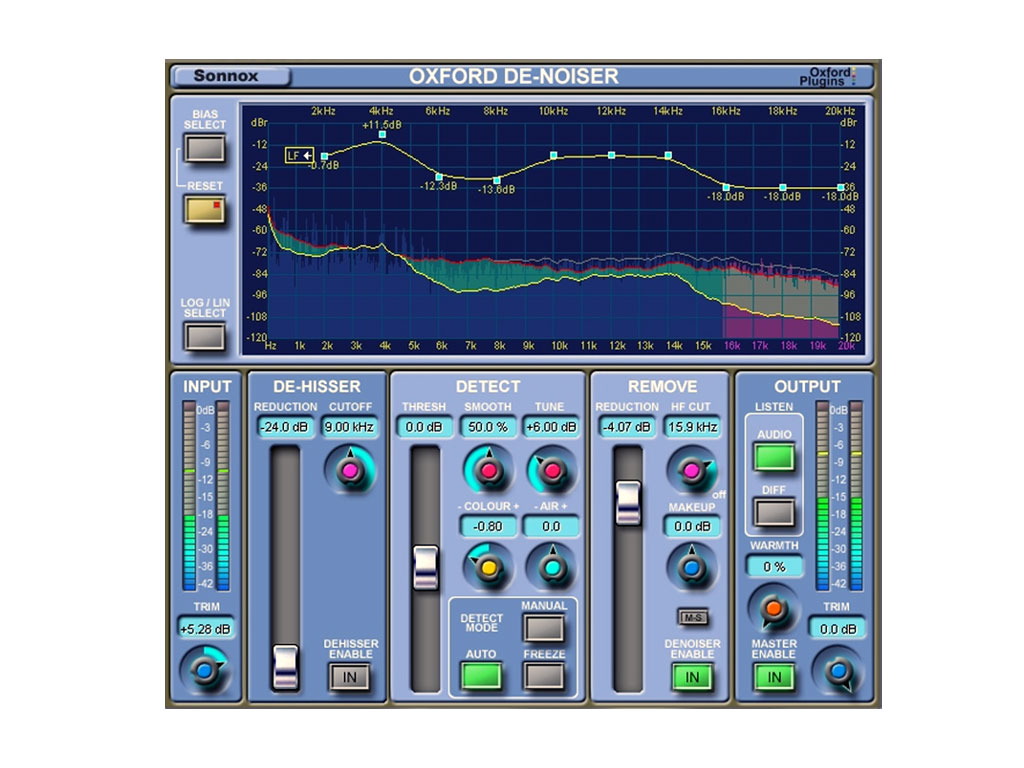 Con il DeNoiser Sonnox plug-in. Questo strumento di restauro offre algoritmi avanzati per sbarazzarsi definitivamente di fastidiosi rumori indesiderati. Ci sono sezioni Dehisser, Detect e Remove separate per un flusso di lavoro intuitivo. Con le efficaci modalità Automatic, Freeze, e Manual, si ha il controllo sul tipo di rumore che si rimuove, assicurandosi di non rimuovere ciò che vuoi che rimanga lì. Precedentemente disponibile solo con il bundle Sonnox Restore, il DeNoiser ora è disponibile singolarmente per VST, AU, RTAS.