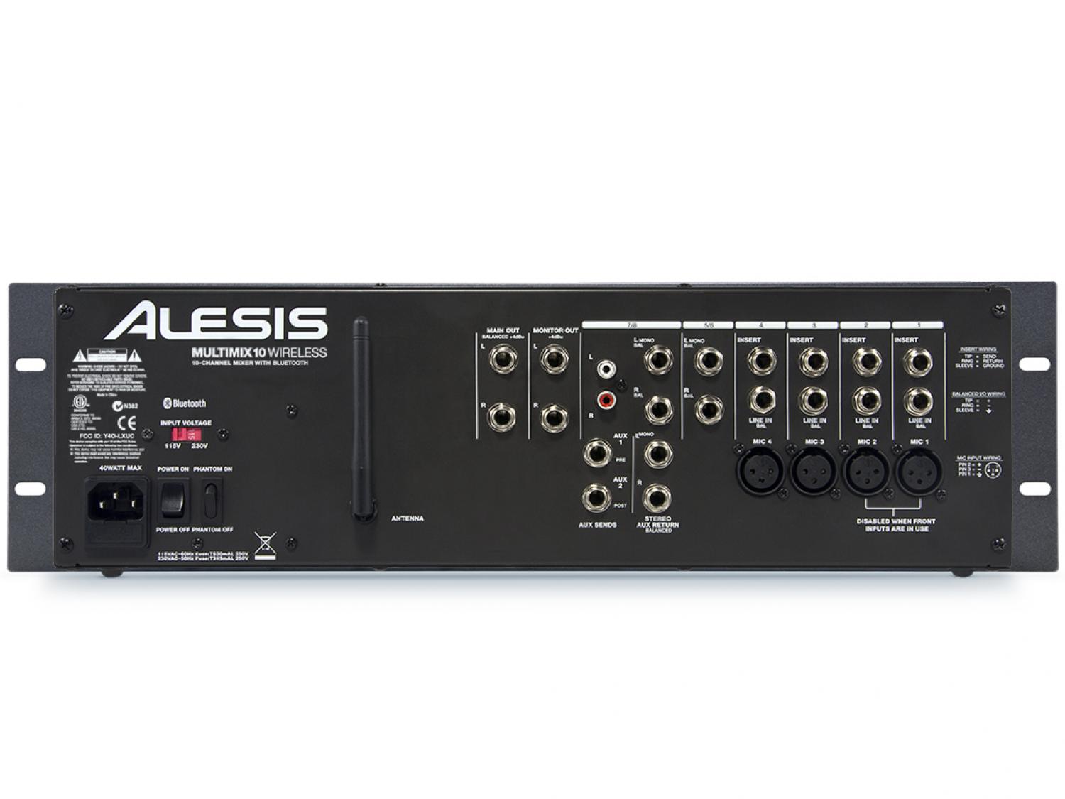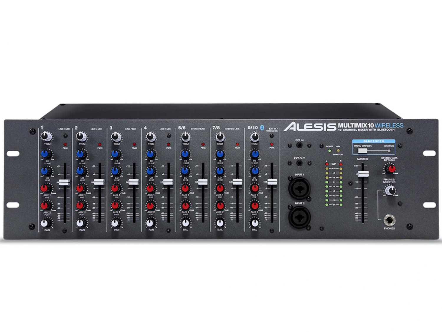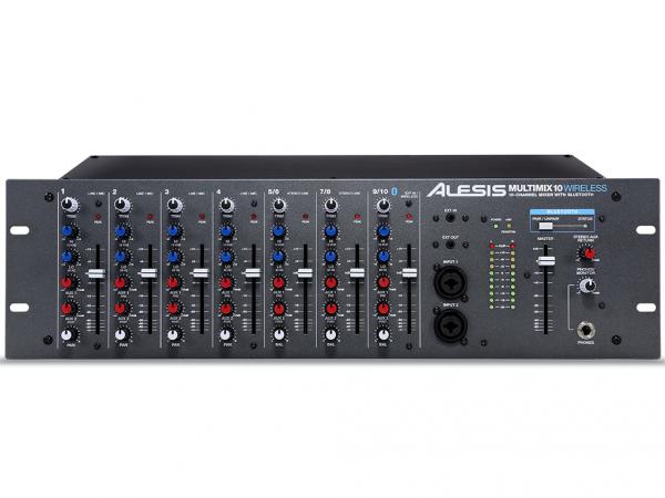 MultiMix 10 Wireless è un mixer 10 canali (4 mono e 3 stereo) dall'ingombro di 3 unità rack che supporta la tecnologia Wireless Bluetooth per ricevere sul canale 9/10 il segnale audio generato da lettori compatibili (cellulari, iPad, iPhone, iPod touch e computer). L'antenna in dotazione è installabile nel retro del mixer, mentre la configurazione del device Bluetooth è fattibile usufruendo del tasto dedicato (Pair/Unpair) presente nell'area master del mixer. Sui canali mono (dall'1 al 4) sono disponibili ingressi XLR microfonici (con alimentazione phantom) e jack da 1/4" per sorgenti line, con connessioni insert TRS per il collegamento diretto di processori hardware esterni. Una particolarità di questo mixer a rack è la presenza di due connettori combo (Jack/XLR) collocati nel pannello frontale, i quali consentono di sostituire quelli presenti nel retro, quindi utilissimi per i collegamenti rapidi, senza dover ricorrere allo smontaggio dal rack, o allo scollegamento dei cavi. I canali stereo (5/6 e 7/8) dispongono di connettori Jack da 1/4" e sono consigliati per il collegamento di sorgenti line (tastiere, lettori CD, sintetizzatori, etc); il canale 7/8 offre anche una coppia (L/R) di connettori RCA. Ogni canale ha un fader da 6cm, led per il monitoraggio del picco, trim, EQ 2-bande, pan e due mandate (Aux 1 e Aux 2) operanti rispettivamente in pre e post fader. Uscita master su connettori Jack da 1/4" bilanciati (TRS) e monitor out sempre formato Jack (L/R). Sull'uscita Master è presente un fader per il controllo del volume e un led stereo multi-segmenti. Nel pannello frontale dell'Alesis MultiMix 10 Wireless troviamo inoltre un'uscita cuffia con controllo di volume dedicato e due connessioni mini-jack da 1/8", rispettivamente un ingresso "fisico" line ausiliare per il canale 9/10 (alternativo al Bluetooth) e un'uscita master direttamente accessibile dal pannello frontale e utile per il collegamento a registratori portatili o altri device per la registrazione audio.