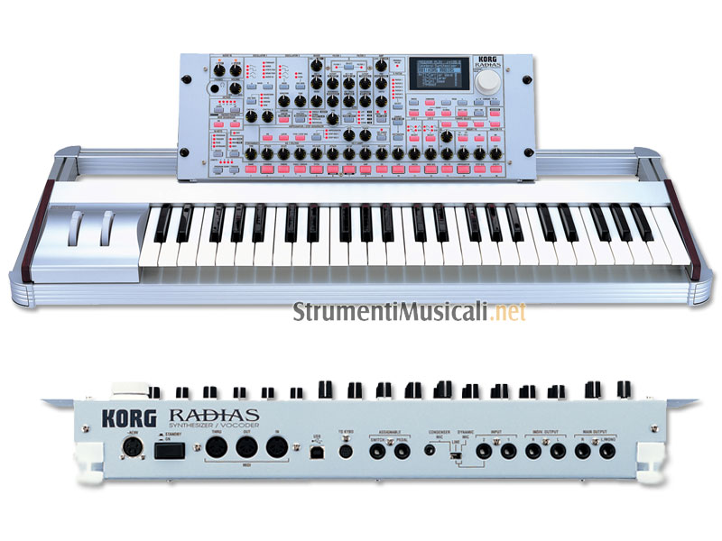 Il RADIAS è un sintetizzatore orginalissimo composto da due unità fondamentali, una tastiera ( RD-KB) e un modulo di generazione sonora (RADIAS R). Il supporto di fissaggio di entrambe le unità garantisce la possibilità di posizionare il modulo in maniera versatile permettendo anche il fissaggio di un computer laptop nella struttura. Lo strumento è facile da usare e risponde prontamente a qualsiasi comando. RADIAS si avvale di una innovativa tecnica di sintesi MPT (Multiple Modeling Technology) che comprende: la modellazione analogica, campioni PCM waves & drum kits, la sintesi wave shaping, la VPM (Virtual Phase Modulation). Con l'assenza di aliasing e un incredible risonanza nei filtri, RADIAS, erede del MS 2000B, segna un enorme salto avanti nel campo della sintesi analogica dove ogni comparazione, spece con i software synth, lo evidenziano come superiore a qualsiasi prodotto concorrente. Ovviamente Korg ha investito molta ricerca per aggiungere anche altri tipi di sintesi per la produzione di sonorità innovative avvolgenti e moderne. 24-note di polifonia e 4 Timbri per Program forniscono infatti enormi possibilità di creazione sonora. La potente architettura di sintesi include due filtri multimodo, la modulazione estensiva il processamento di segnale audio esterno e altro. Il Vocoder con l'esclusiva funzione Formant Motion permette la creazione di timbriche dall'effetto "parlante" mentre 3 Modulatori,2 Step Sequencers ed un Arpeggiatore aggiungono ritmi, fraseggi melodici e