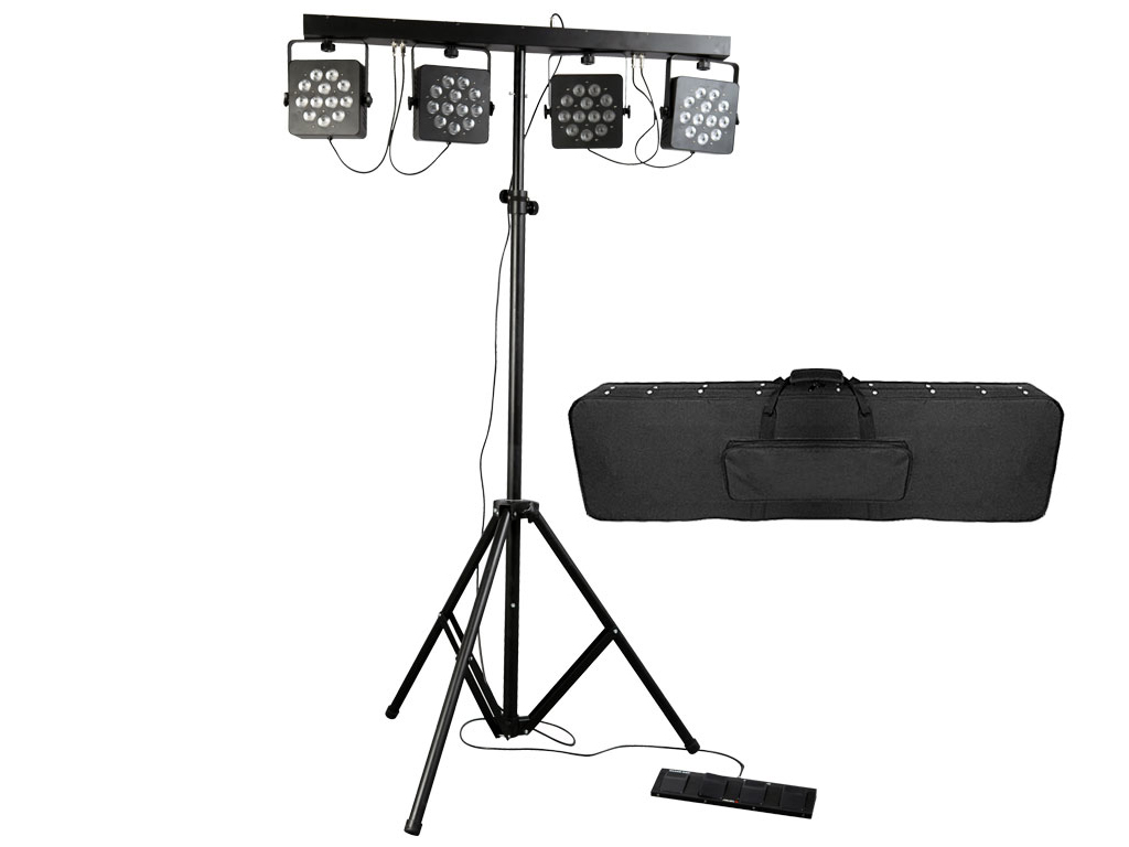 Kit di 4 proiettori a 12 LED di potenza full colour con barra di supporto che può ricevere sia un segnale DMX che analogico tramite pedaliera.