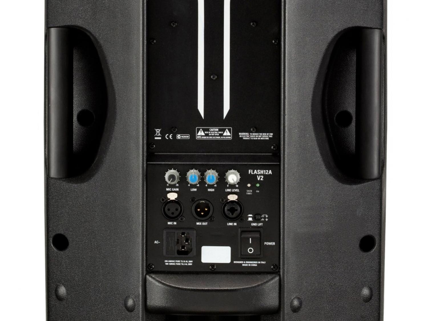 I modelli FLASH serie V2 presentano un modulo di amplificazione completamente nuovo, con la sezione delle basse frequenze in Classe D ed alimentazione Switching. Grazie a questa nuova tecnologia il peso dei diffusori si riduce notevolmente, pur garantendo una potenza uguale o superiore. Su questi modelli il driver a compressione viene sostituito con un nuovo driver Celestion, in grado di migliorarne sia l'efficienza che l'estensione della risposta. E' stata inoltre ridisegnata la griglia di protezione, che presenta un look rinnovato ad una robustezza ancora maggiore.